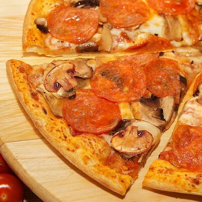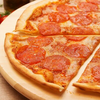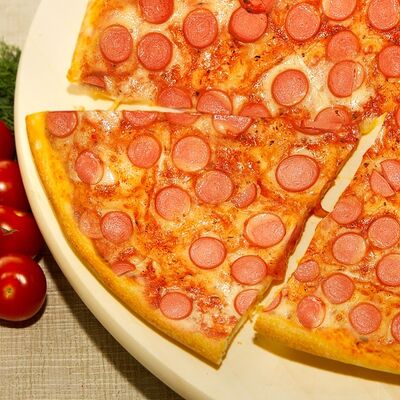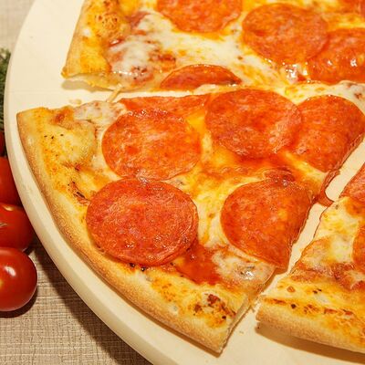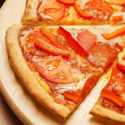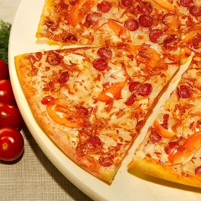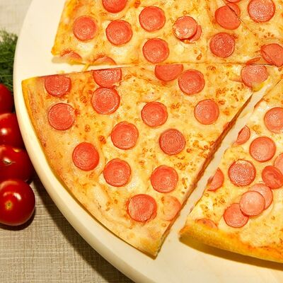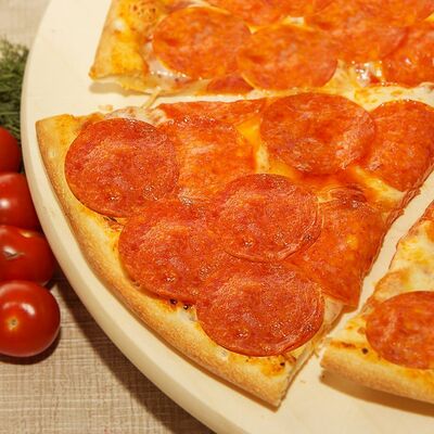 Жгучая пицца на итальянском тесте с пепперони, острым перчиком, моцареллой и фирменным томатным соусом