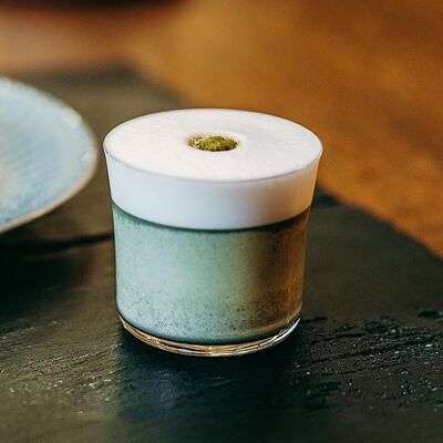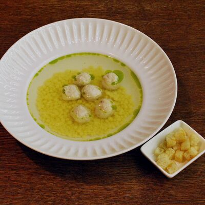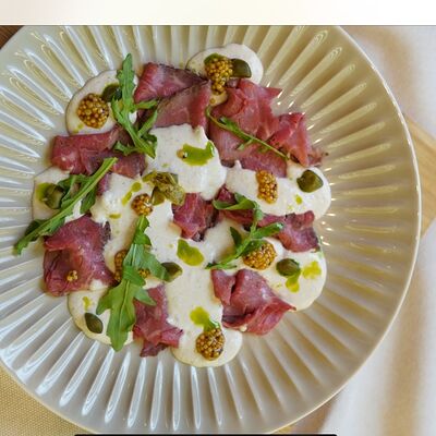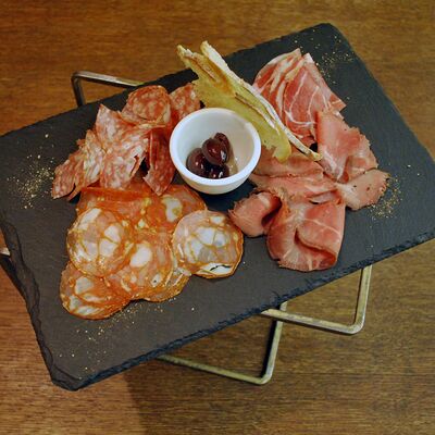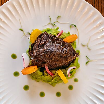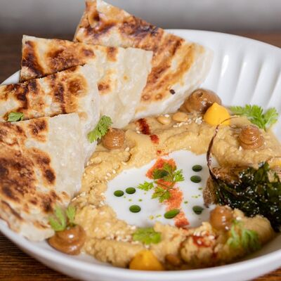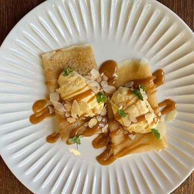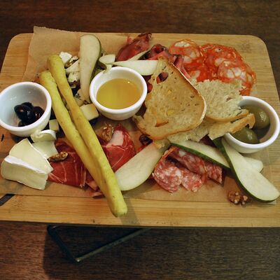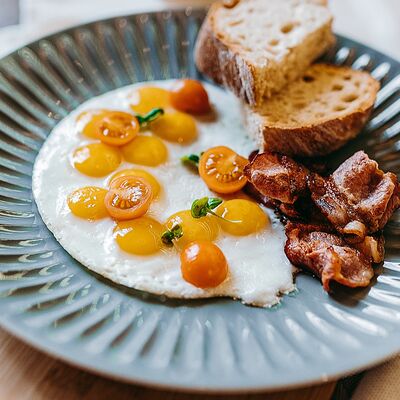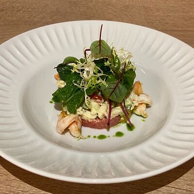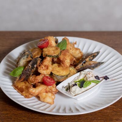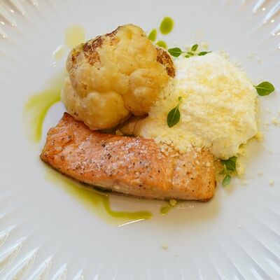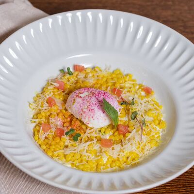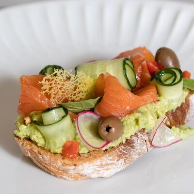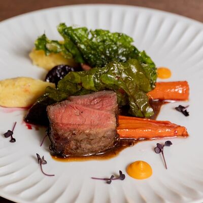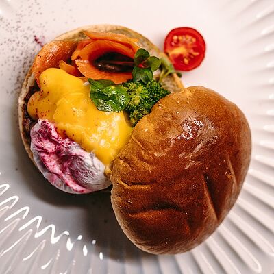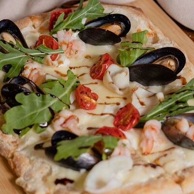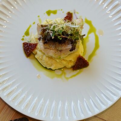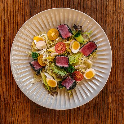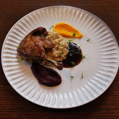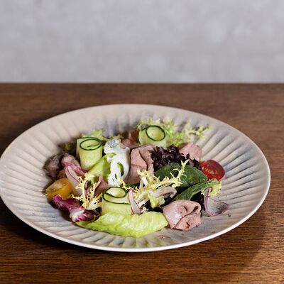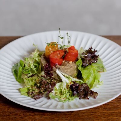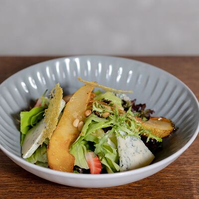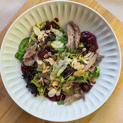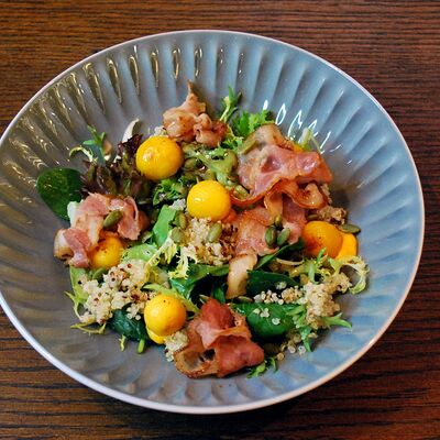 Салатные листья, запеченная тыква, обжаренный бекон, киноа, семечки тыквы, медово-цитрусовая заправка