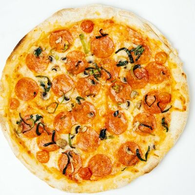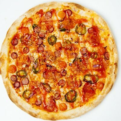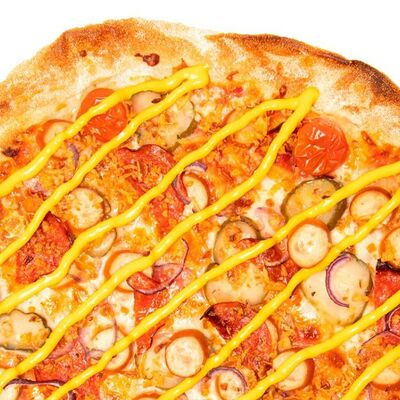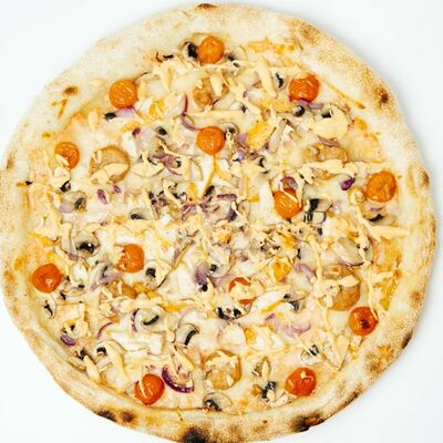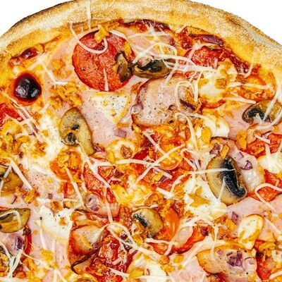 Соус томатный, моцарелла, ветчина, курица, пепперони, бекон, томаты, лук красный, шампиньон, пармезан, ворчестер, специи (33 см)