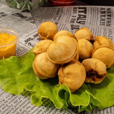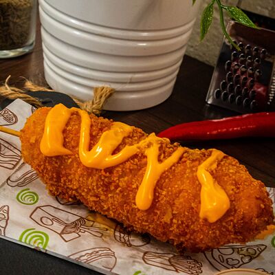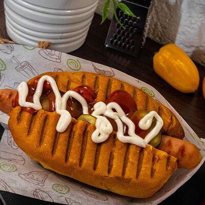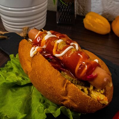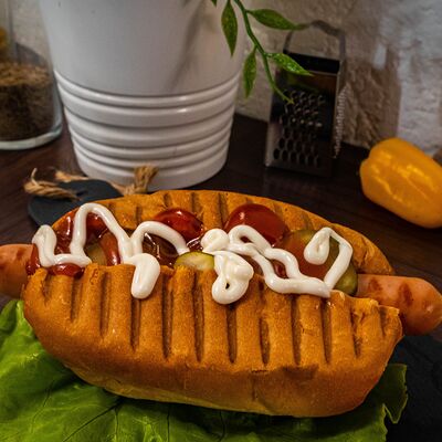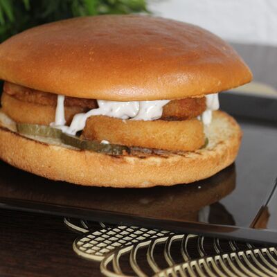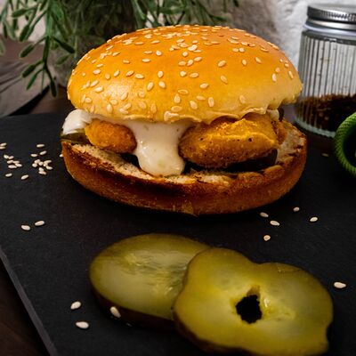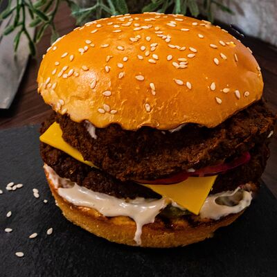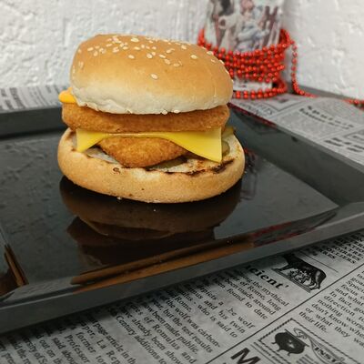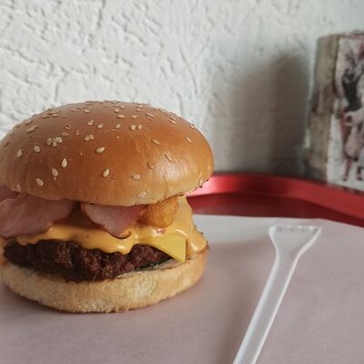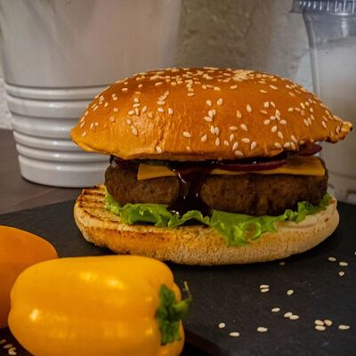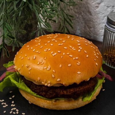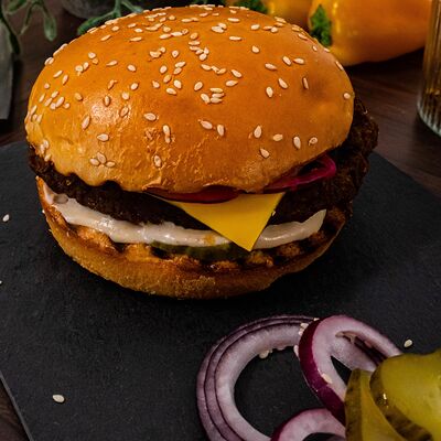 Булочка с кунжутом, котлетка из говядины, маринованный огурчик, лучок и соус собственного производства с горчичкой