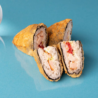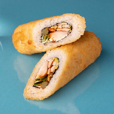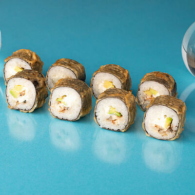 Рис, нори, курица, соус барбекю, лист салата, корнишоны, сыр сливочный, лук зеленый, сухари панировочные