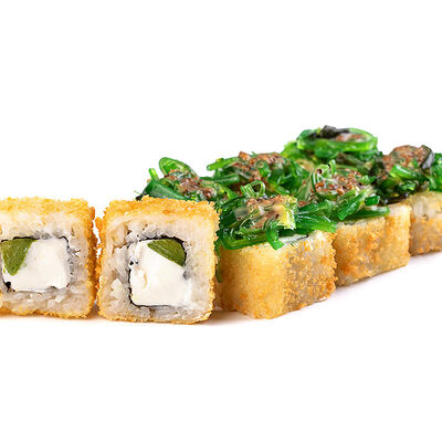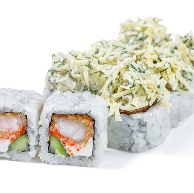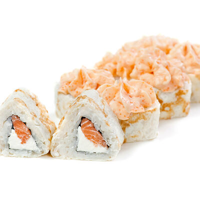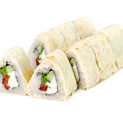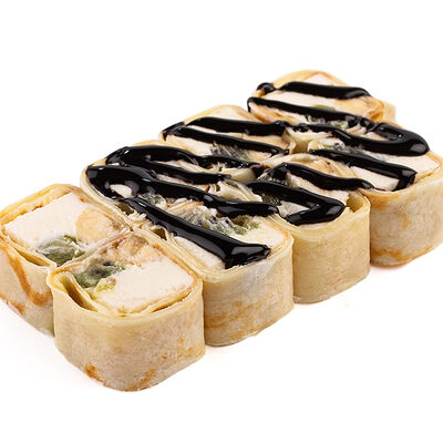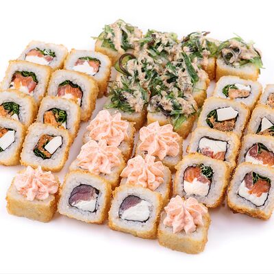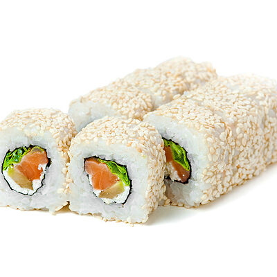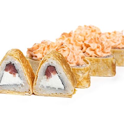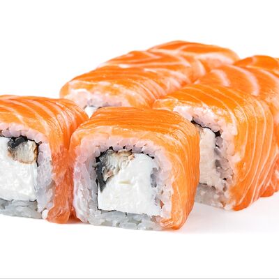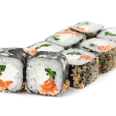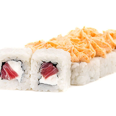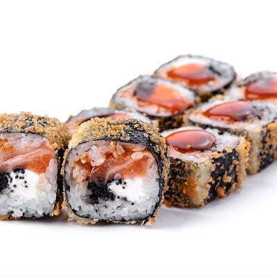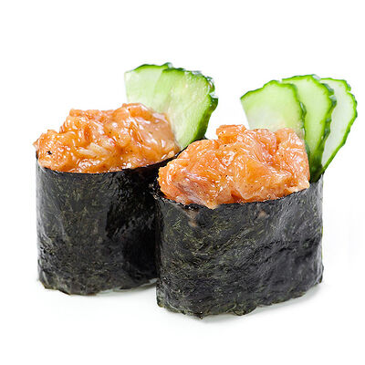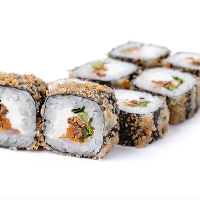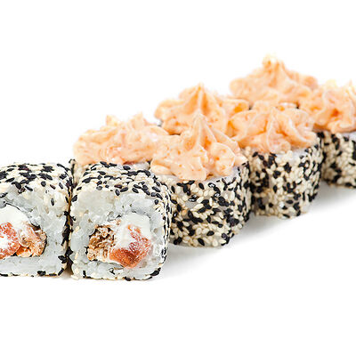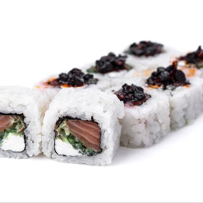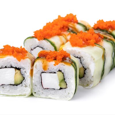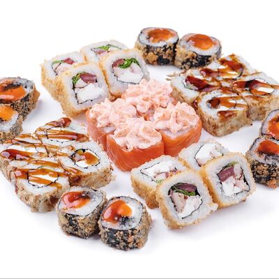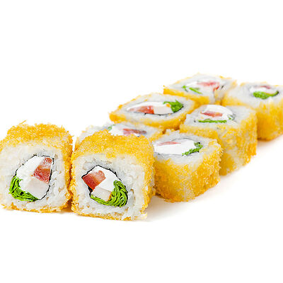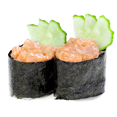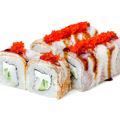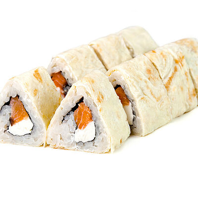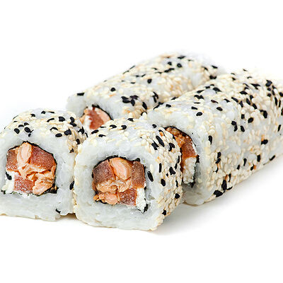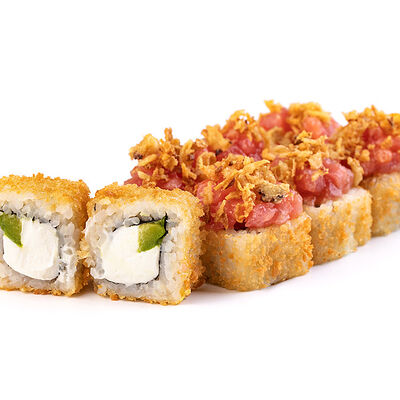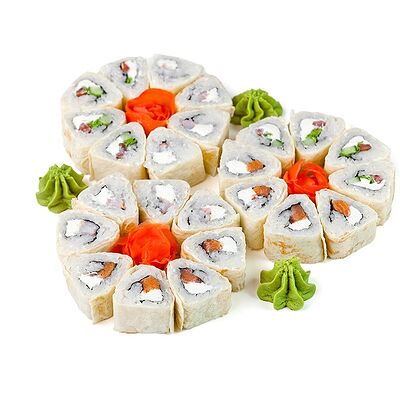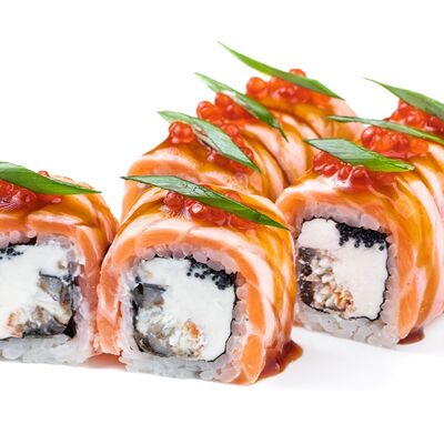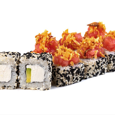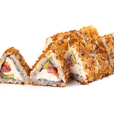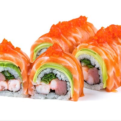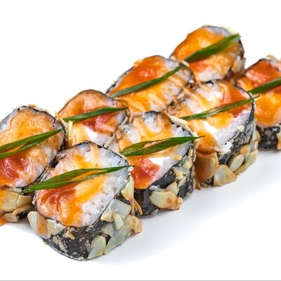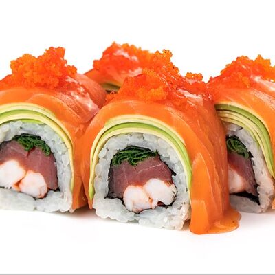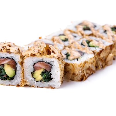 Ролл с лососем, салатом чука, авокадо, обвален в стружку тунца и полит ореховым соусом. Васаби, имбирь и соевый соус, необходимо заказывать отдельно (категория Соусы)