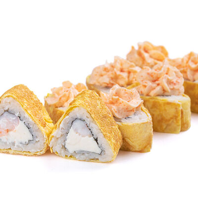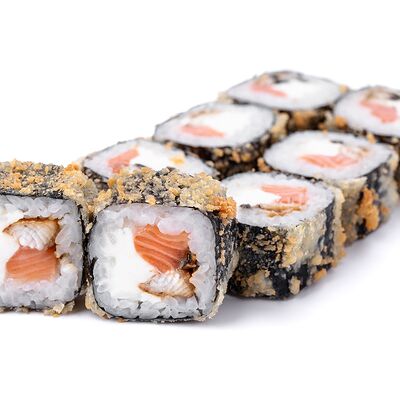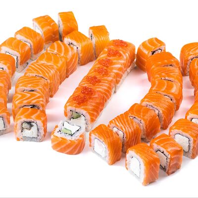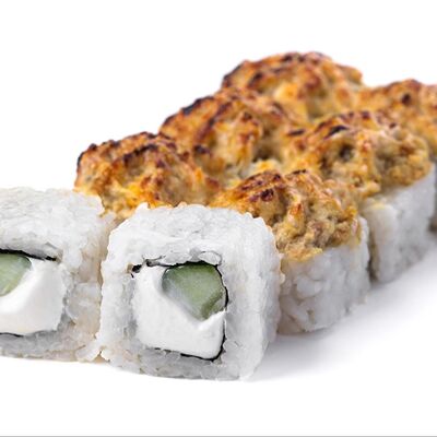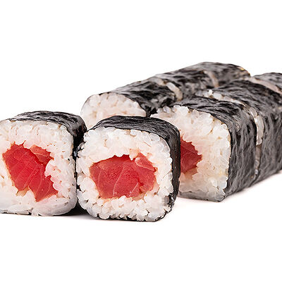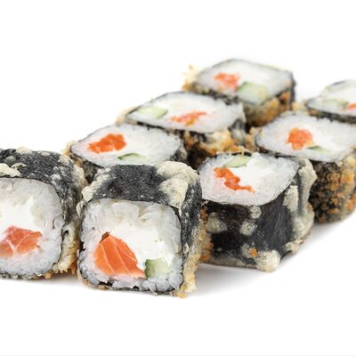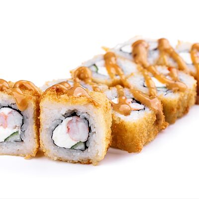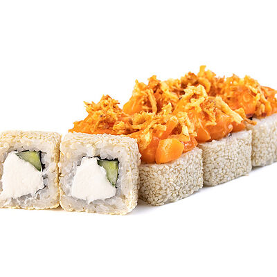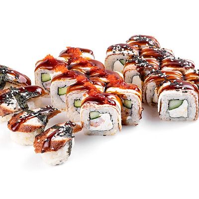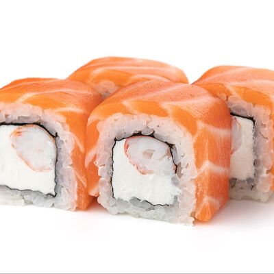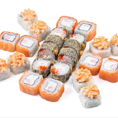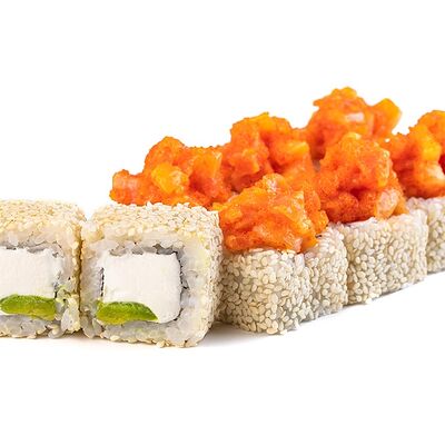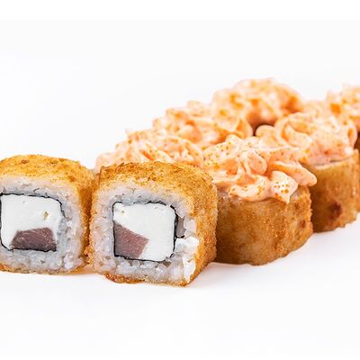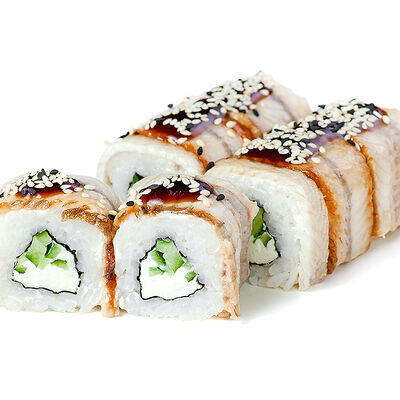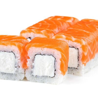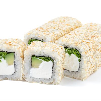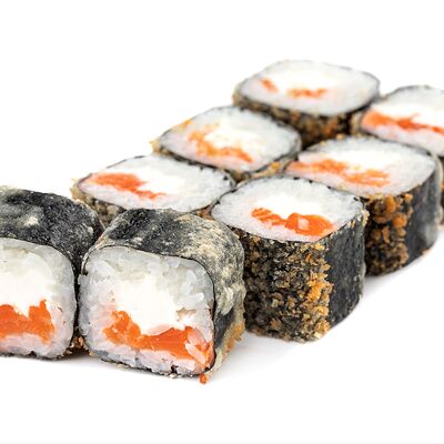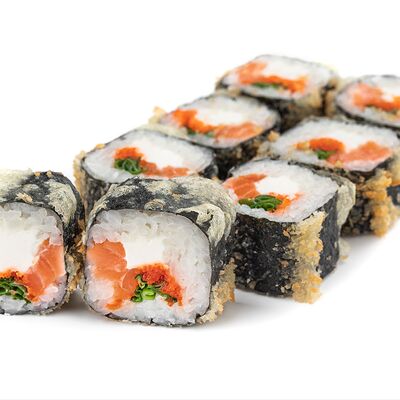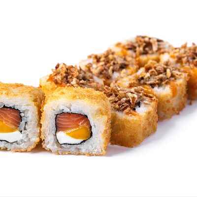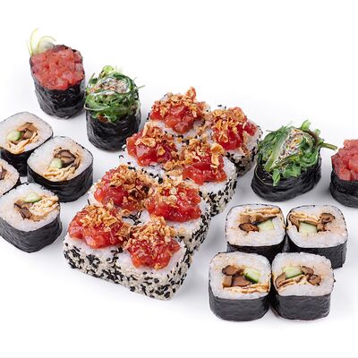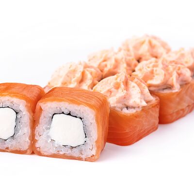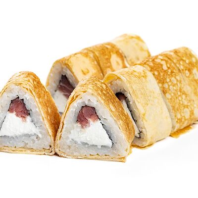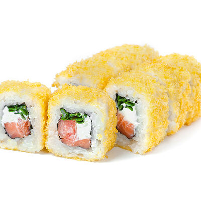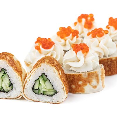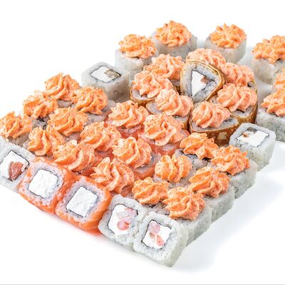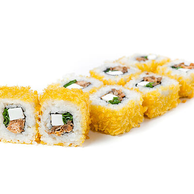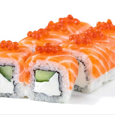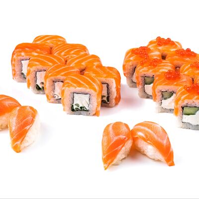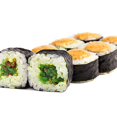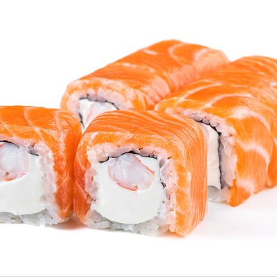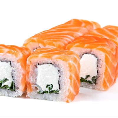 Ролл с лососем, салатом чука, авокадо, обвален в стружку тунца и полит ореховым соусом. Васаби, имбирь и соевый соус, необходимо заказывать отдельно (категория Соусы)