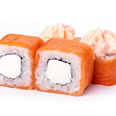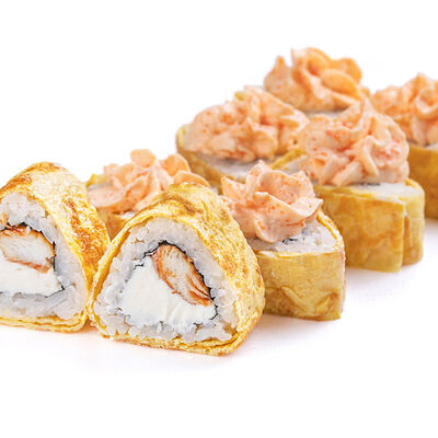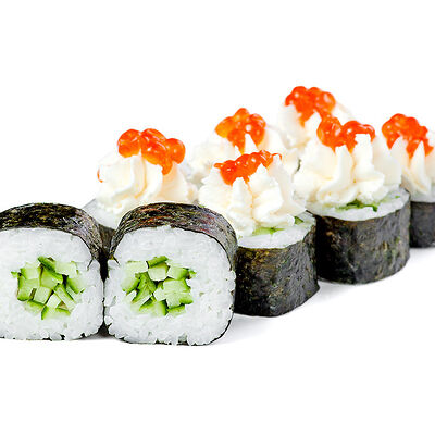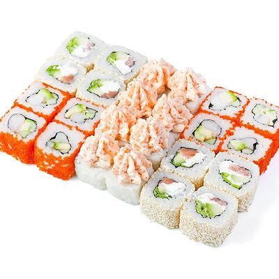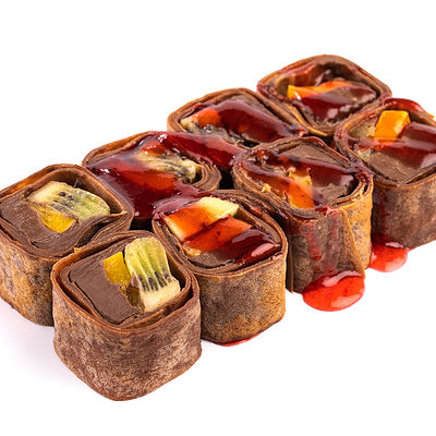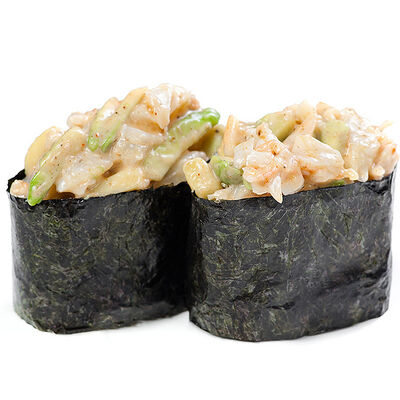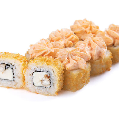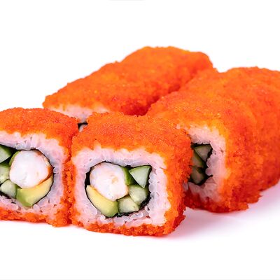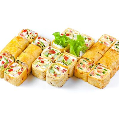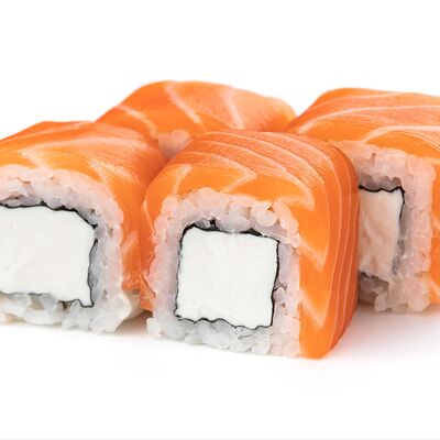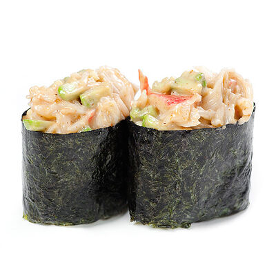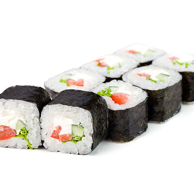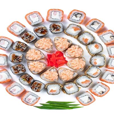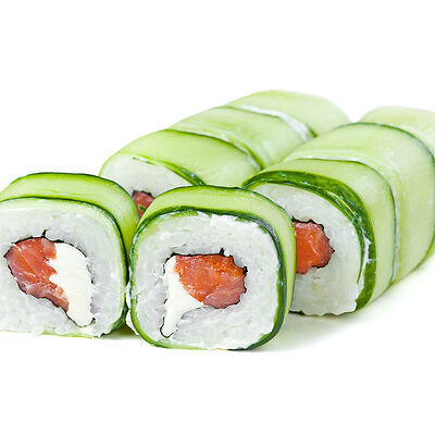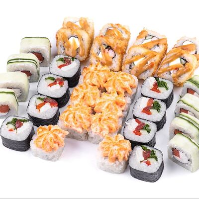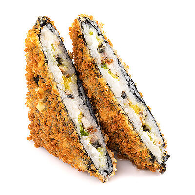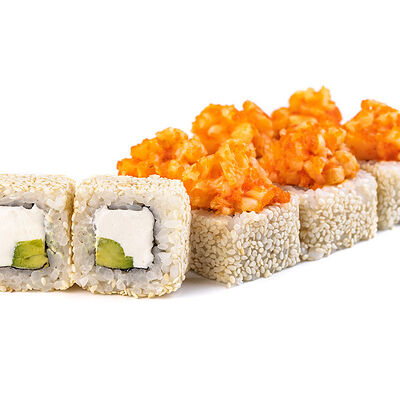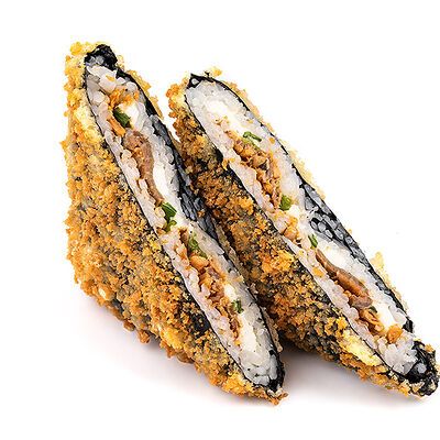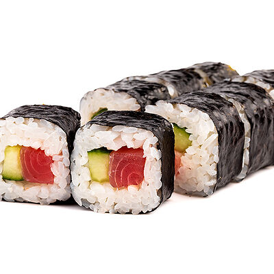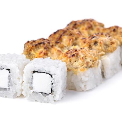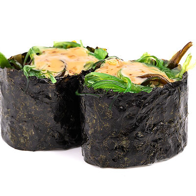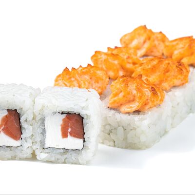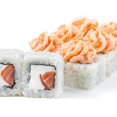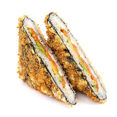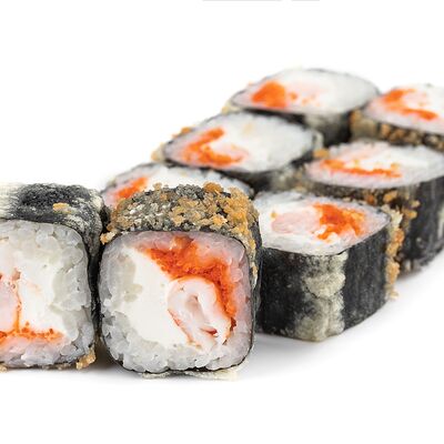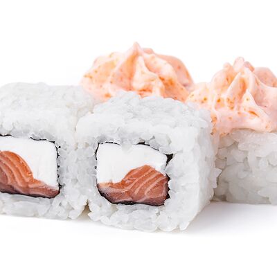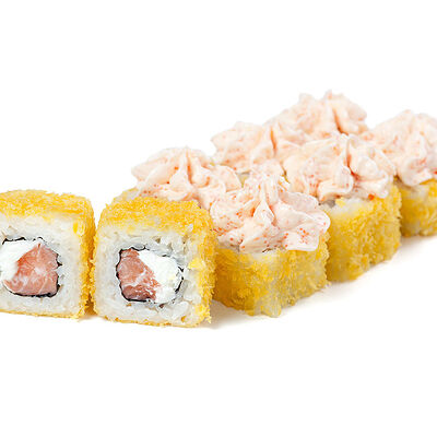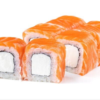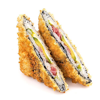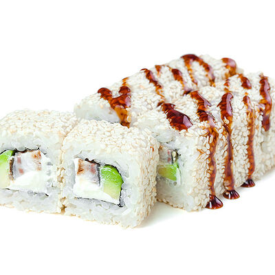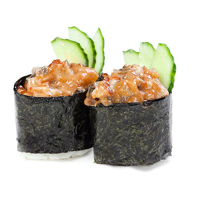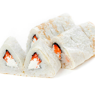 Ролл с лососем, салатом чука, авокадо, обвален в стружку тунца и полит ореховым соусом. Васаби, имбирь и соевый соус, необходимо заказывать отдельно (категория Соусы)