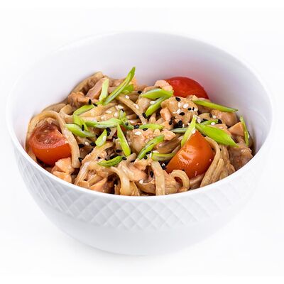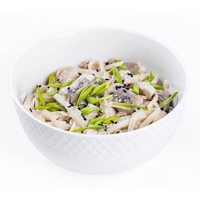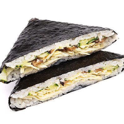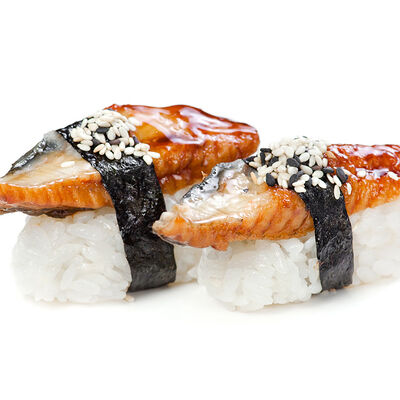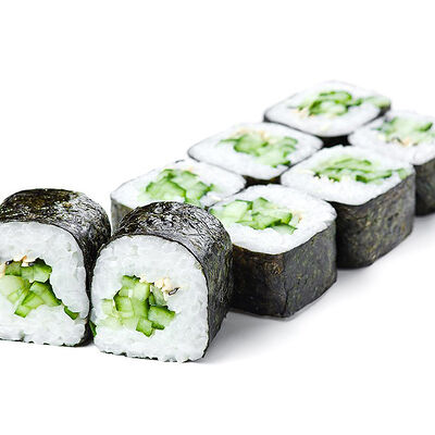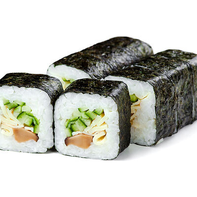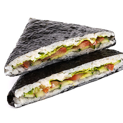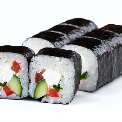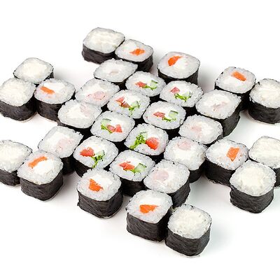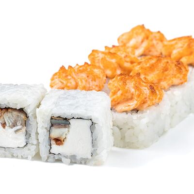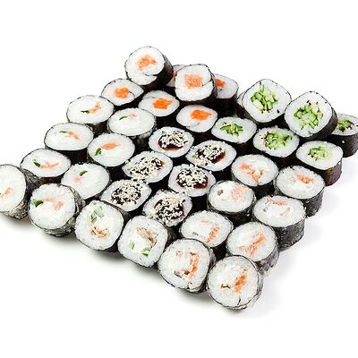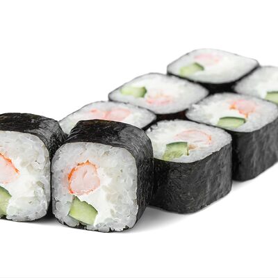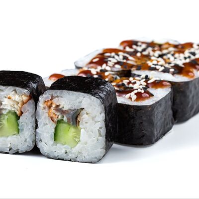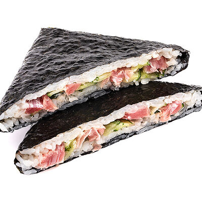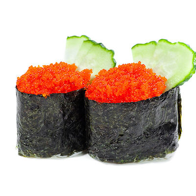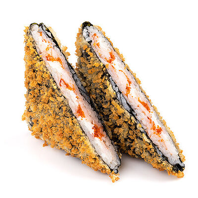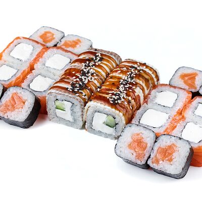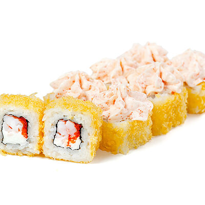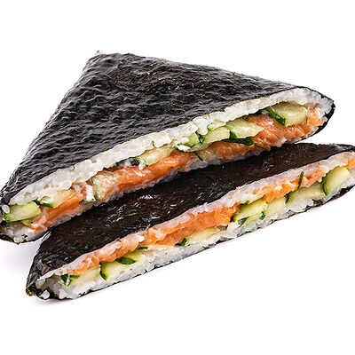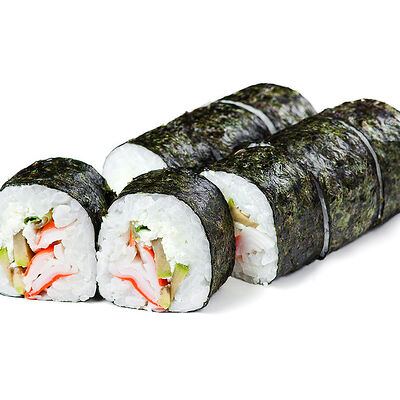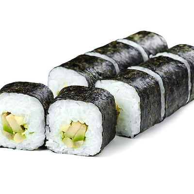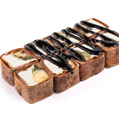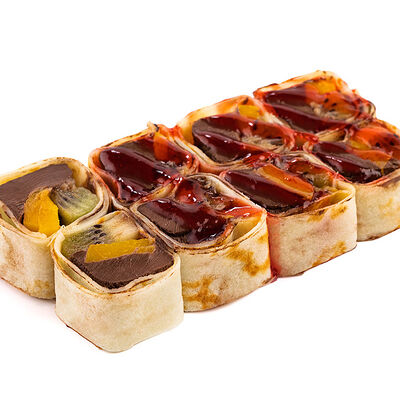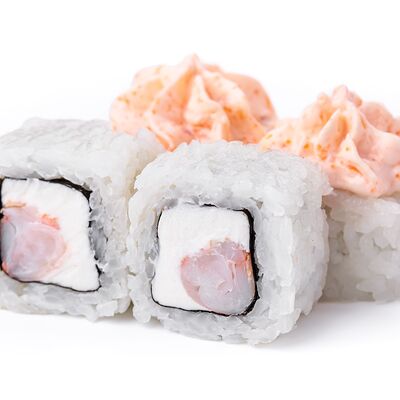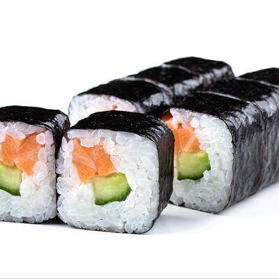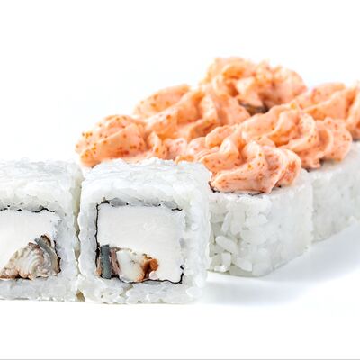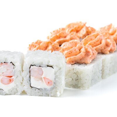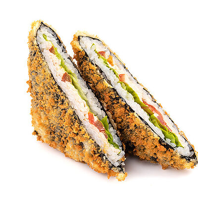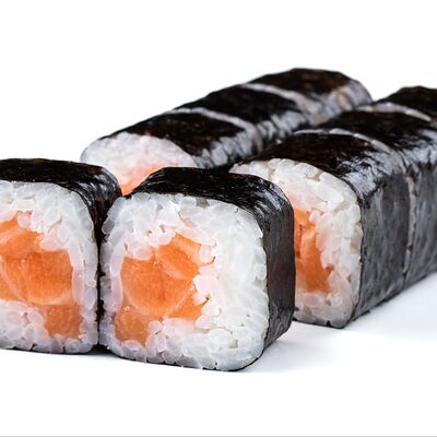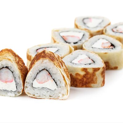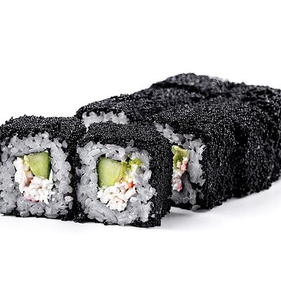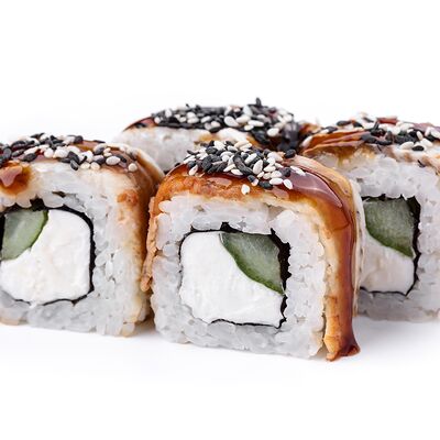 Ролл с лососем, салатом чука, авокадо, обвален в стружку тунца и полит ореховым соусом. Васаби, имбирь и соевый соус, необходимо заказывать отдельно (категория Соусы)