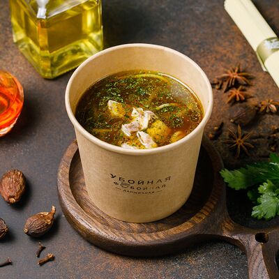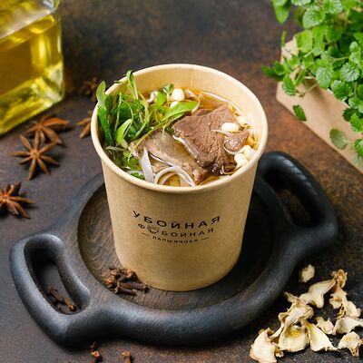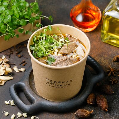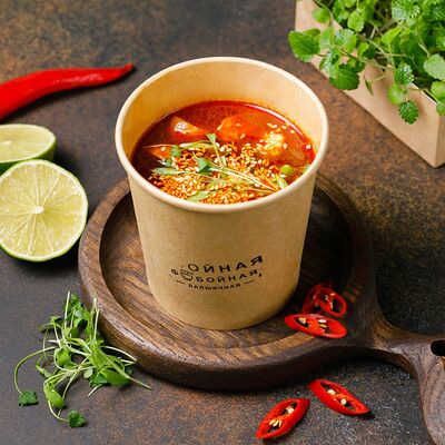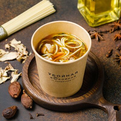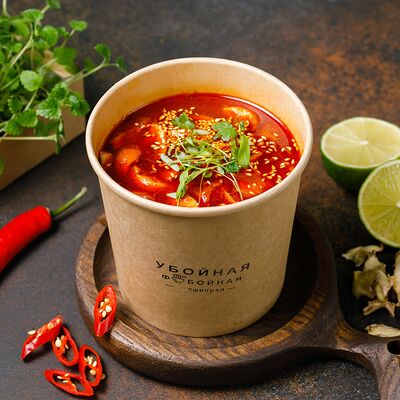 Яичная лапша, лангустины, лук, морковь, томат, отвар из цыпленка, биск, соевый соус, рыбный соус, паста том ям, шрирача, зелень петрушки, лук фри