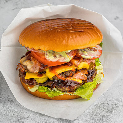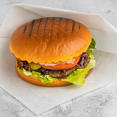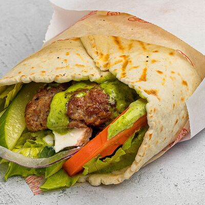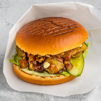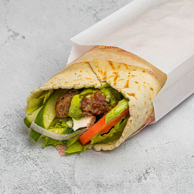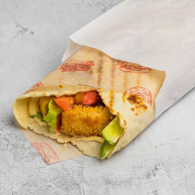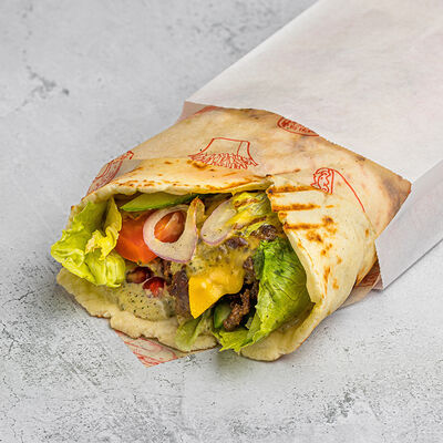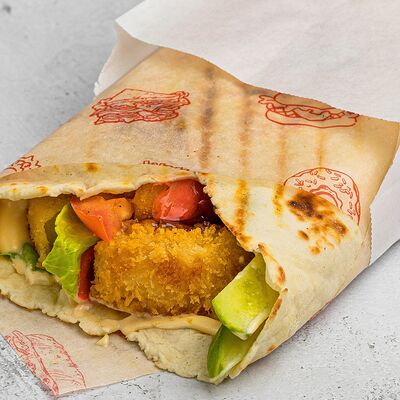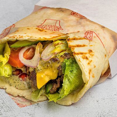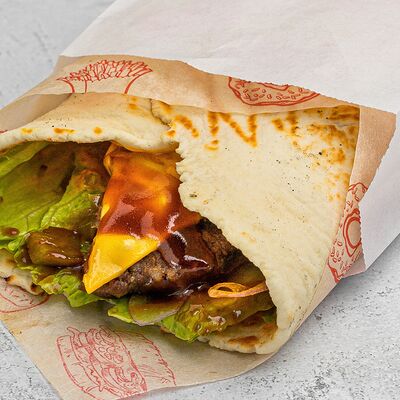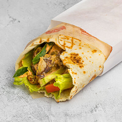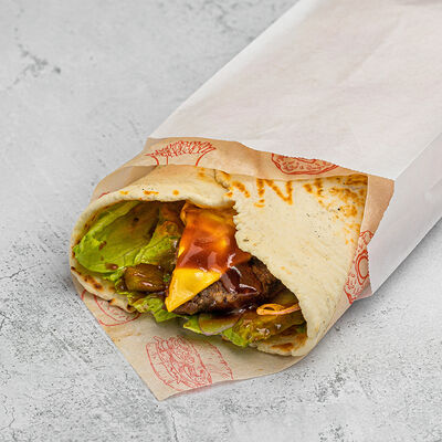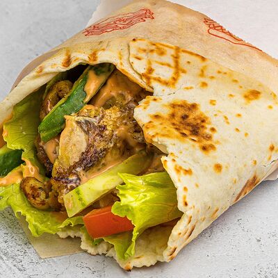 Лаваш домашний, бедро куриное, соус барбекю, салат айсберг, огурец свежий, томат свежий