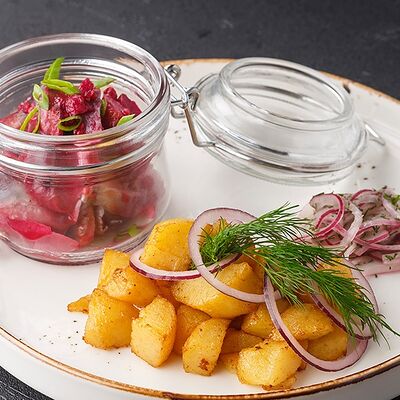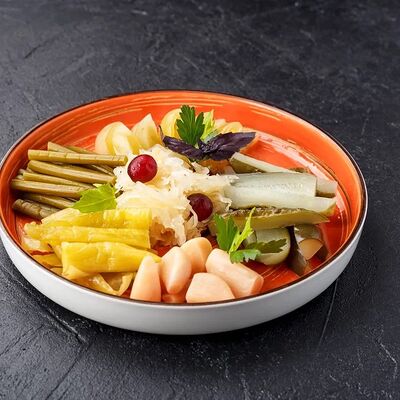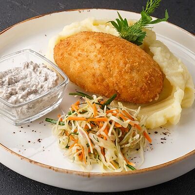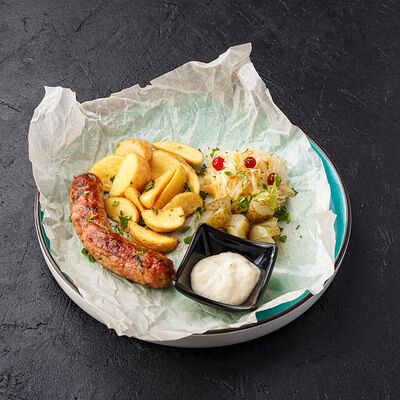 Куриная колбаска с домашней квашеной капустой с клюквой, картофельными дольками и соленым огурчиком. Подается с хреном
