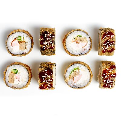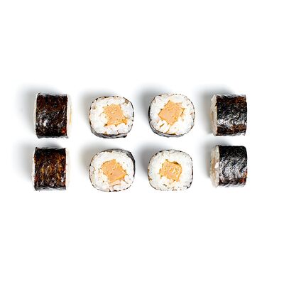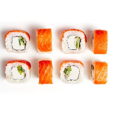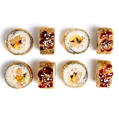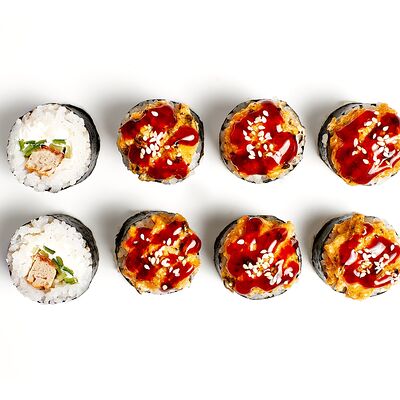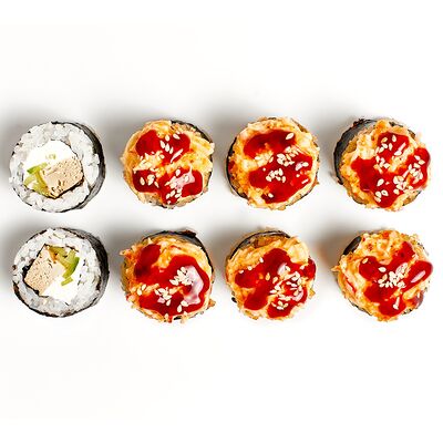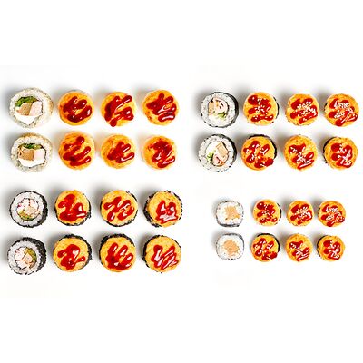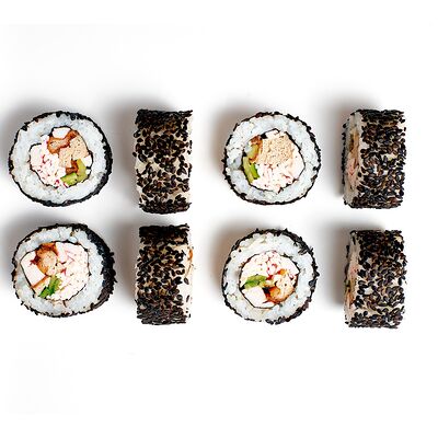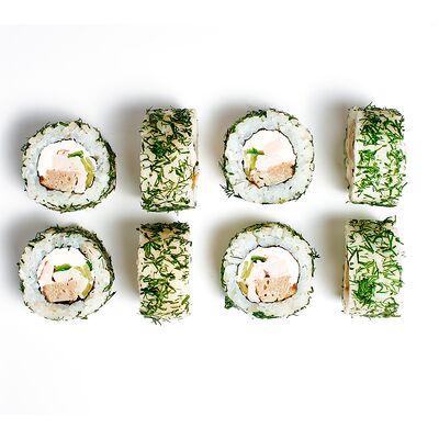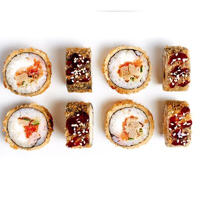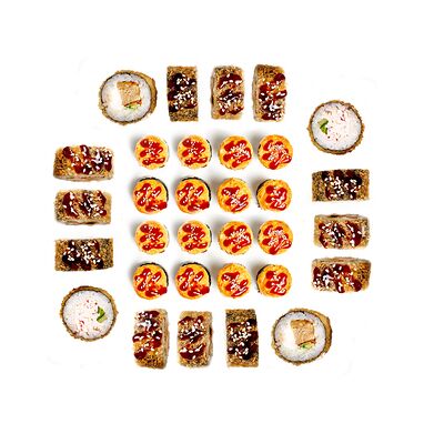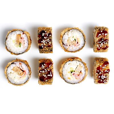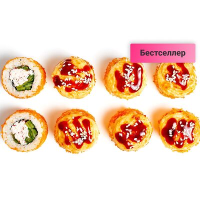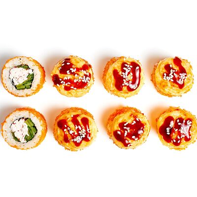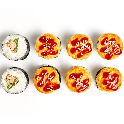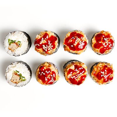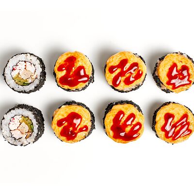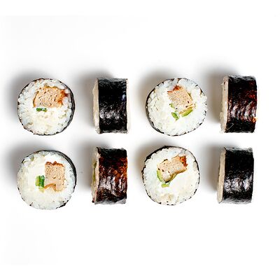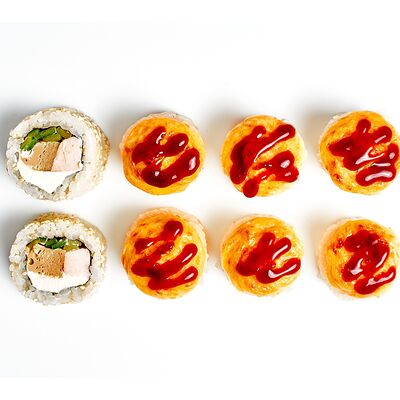 Копченая курица, сливочный сыр, тамаго, рис, свежий огурец, нори, сырный соус, унаги-соус. Соусы и специи в комплект не входят