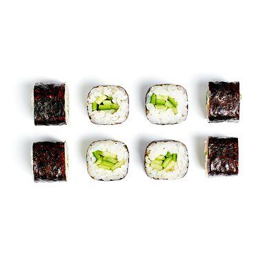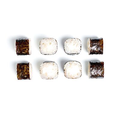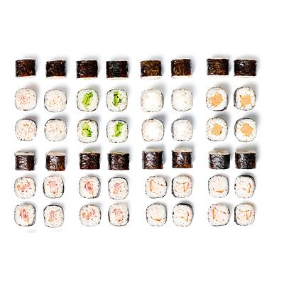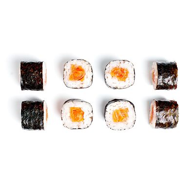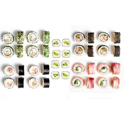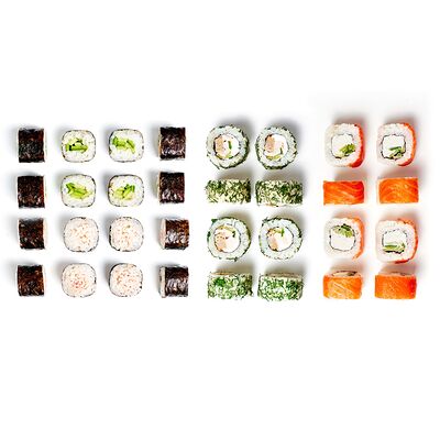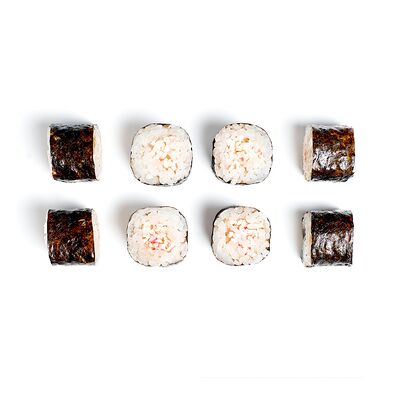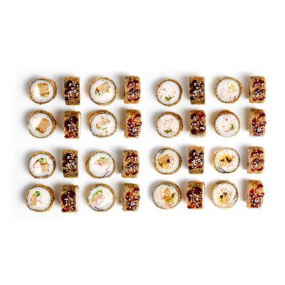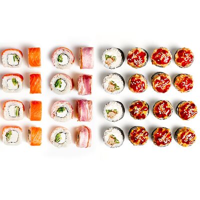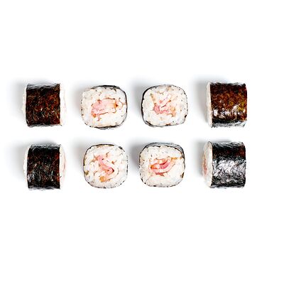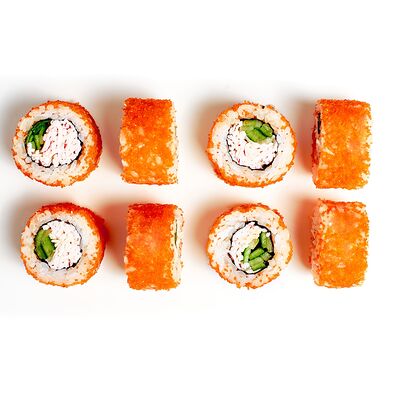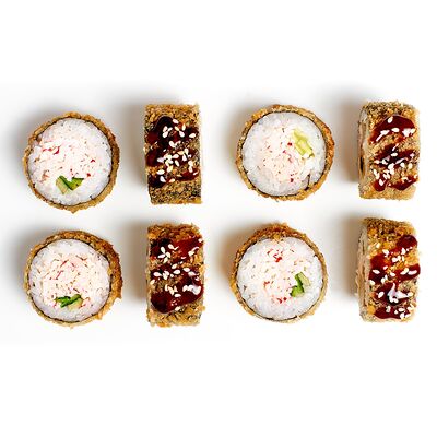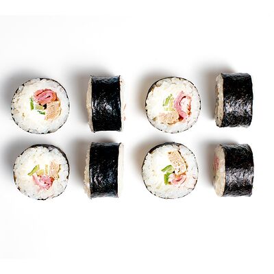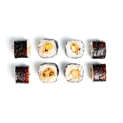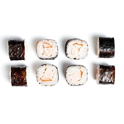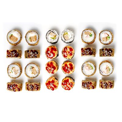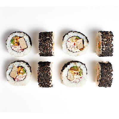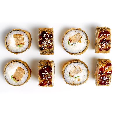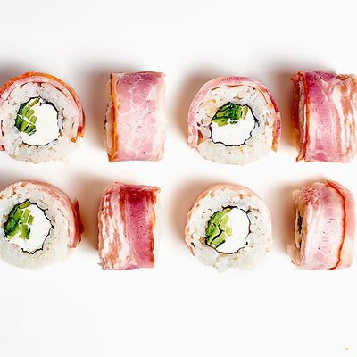 Копченая курица, сливочный сыр, тамаго, рис, свежий огурец, нори, сырный соус, унаги-соус. Соусы и специи в комплект не входят