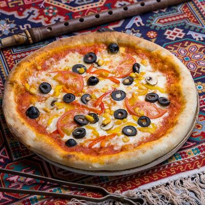 Красный соус, моцарелла, перец болгарский, оливки, помидор, кукуруза.32см