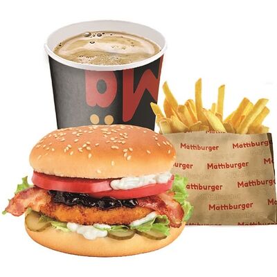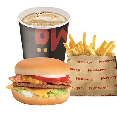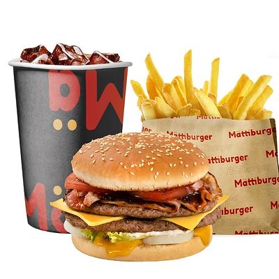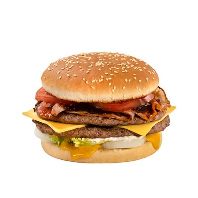 Булочка пшеничная с кунжутом, две говяжьих котлеты, сыр Чеддер, салат Айсберг, помидоры, маринованные огурцы, майонезные соусы Тартар и Тейсти бургер