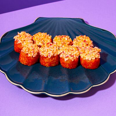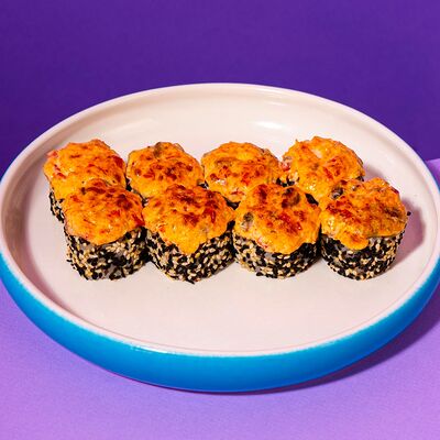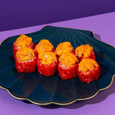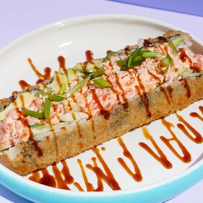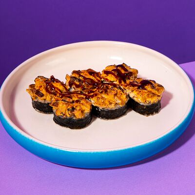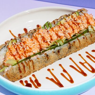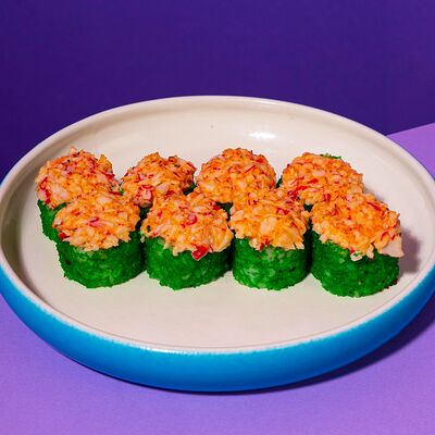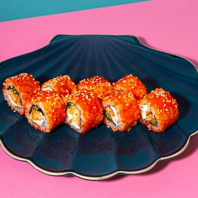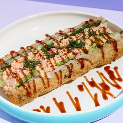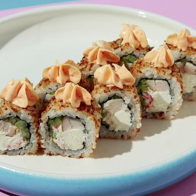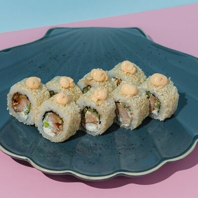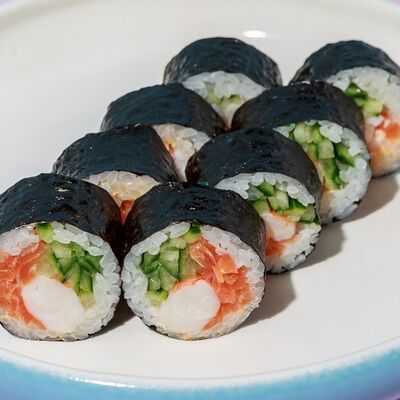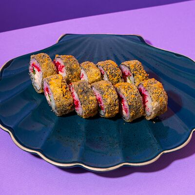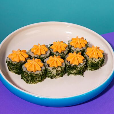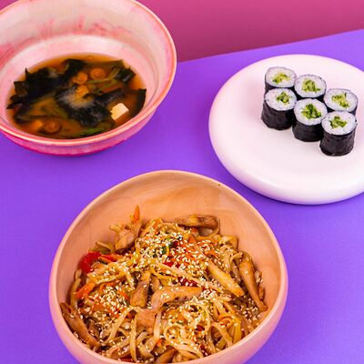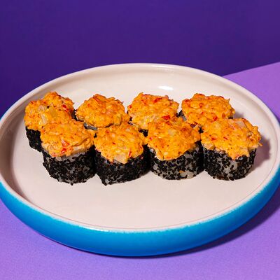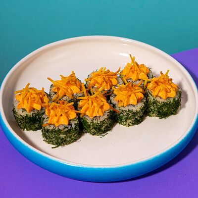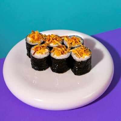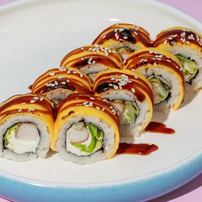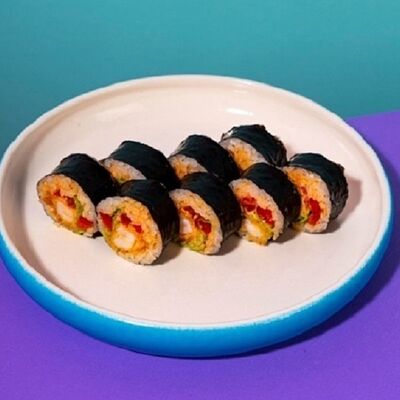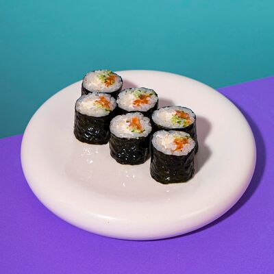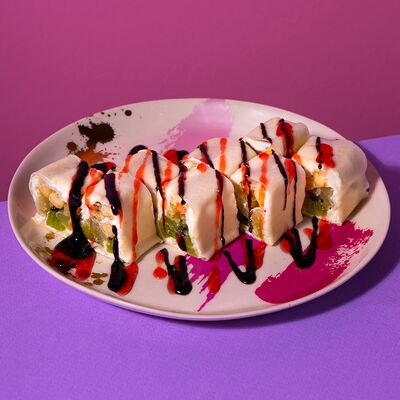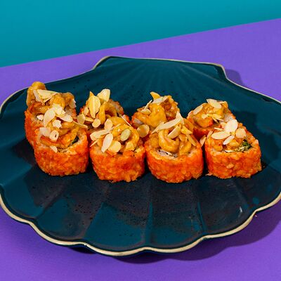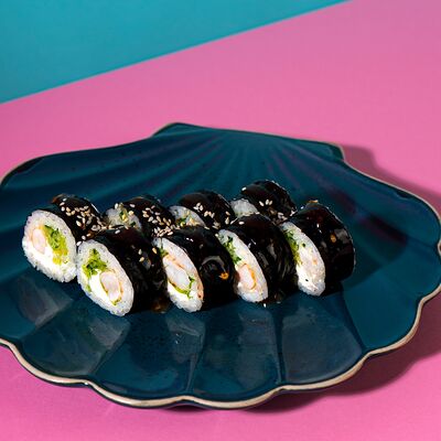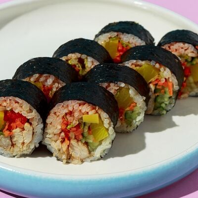 Куриное филе, капуста кимчи, морковь, огурец, редька такуан, ореховый соус. Корейский ролл кимпаб, который завоевал сердца гурманов со всего мира. Ощутите сочность курочки, остроту капусты кимчи, свежесть моркови и огурца, хруст редьки такуан и аромат орехового соуса