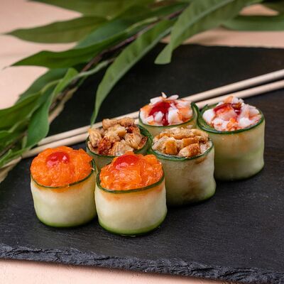 Якудза с лососем, ролл с лососем и острым крабом, запеченный ролл с крабом и гребешком
