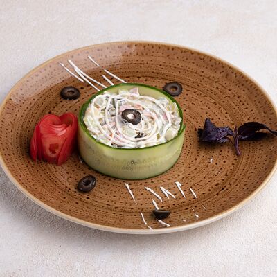 Колбаса, картофель, свежий огурец, солёный огурец, яйцо варёное, морковь, зелёный горошек, майонез