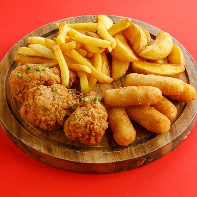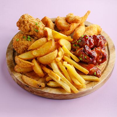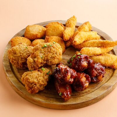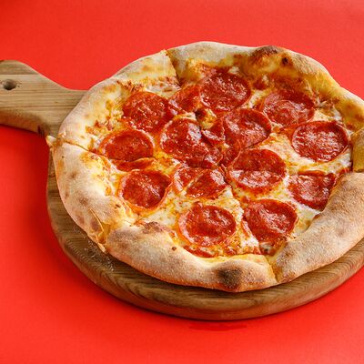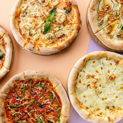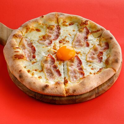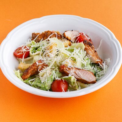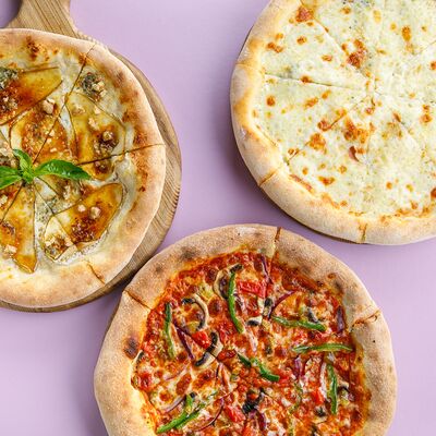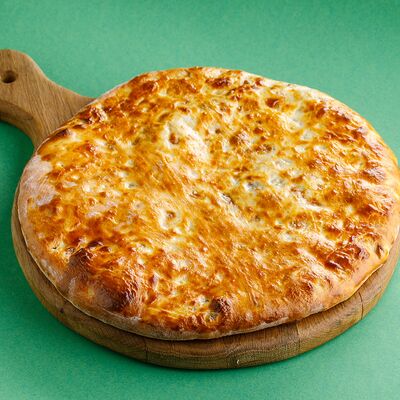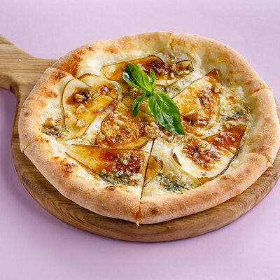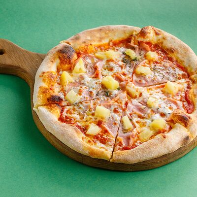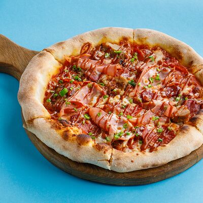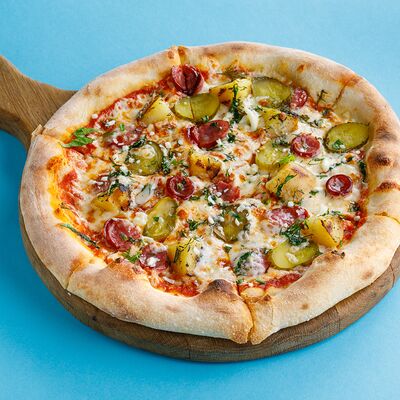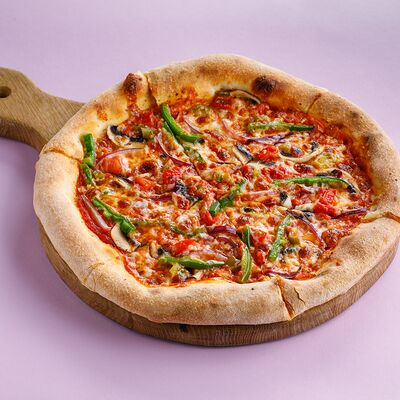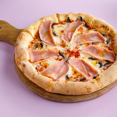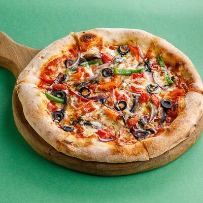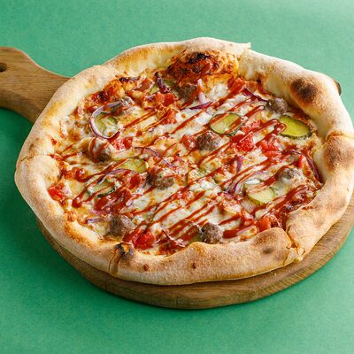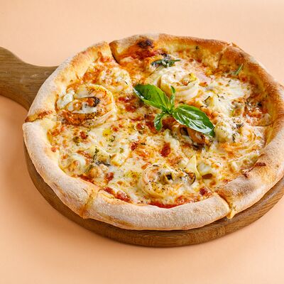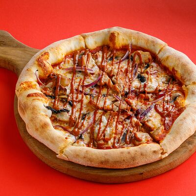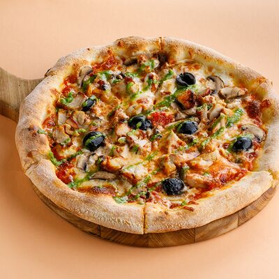 Томатный соус, моцарелла, шампиньоны, цыпленок в маринаде, маслины, соус песто (27 см)