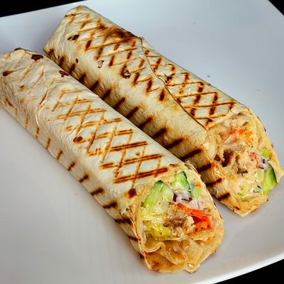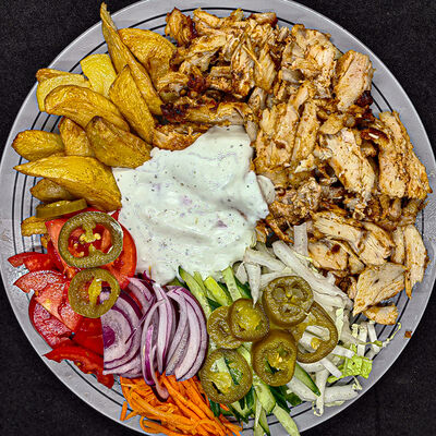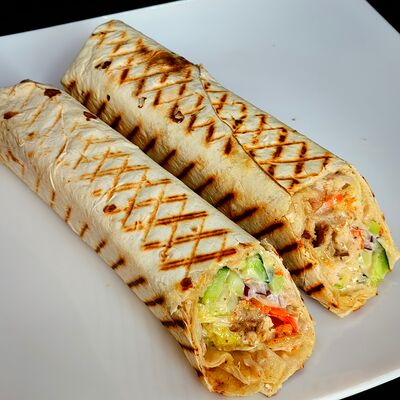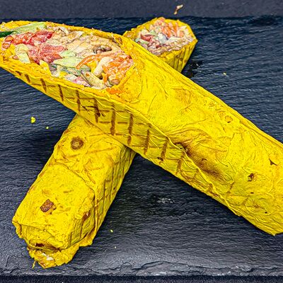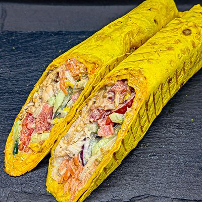 Сырный лаваш, курица, лук маринованный, огурец свежий, томат свежий, китайская капуста, морковь по-корейски, картофель, халапеньо, горчичный и чесночный соус