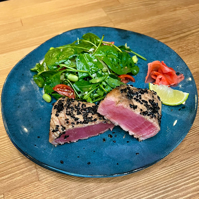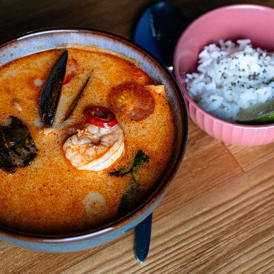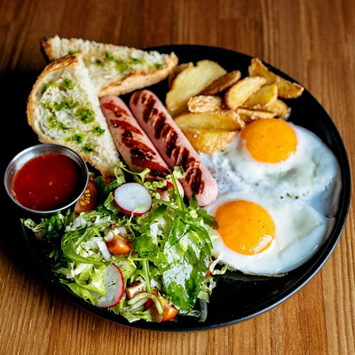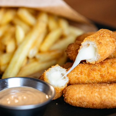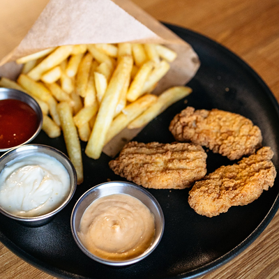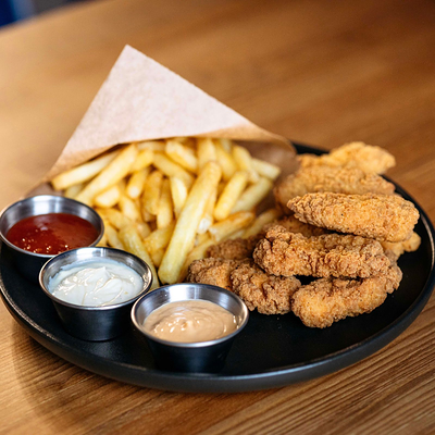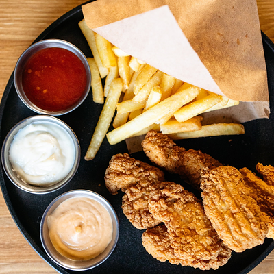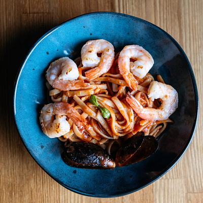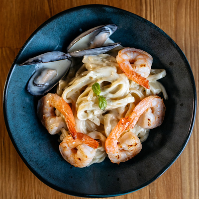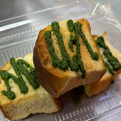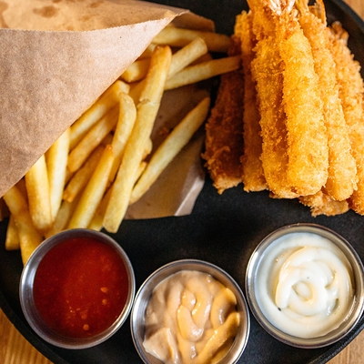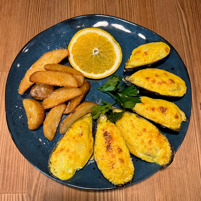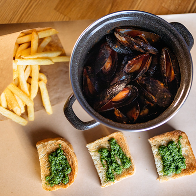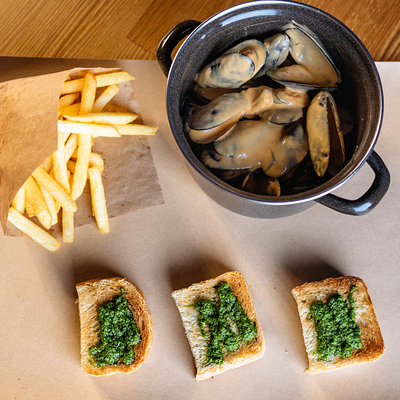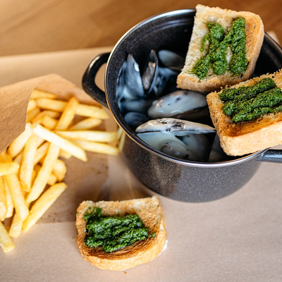 Мидии в томатном соусе, хрустящий багет, соус песто и картофель фри
