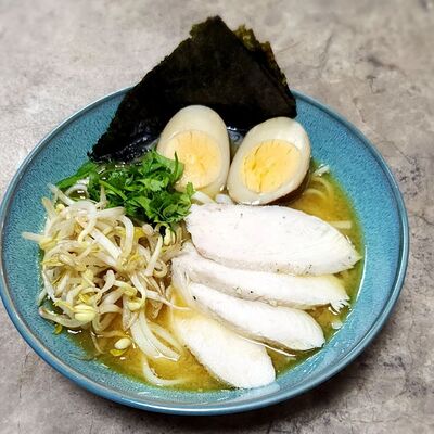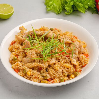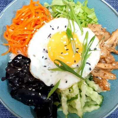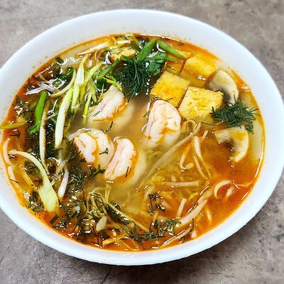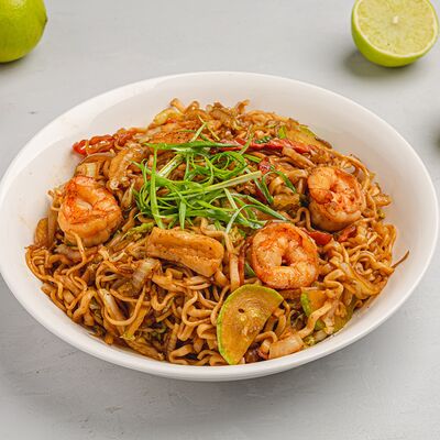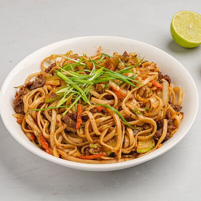 Пшеничная лапша, репчатый лук, кабачок, морковь, ростки бобов, зеленый лук, китайская капуста, соевый соус