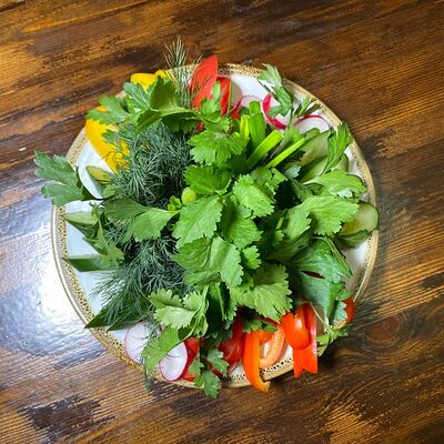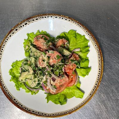 Вкусное сочетание свежих огурцов, помидоров, ароматной зелени, лука репчатого и сыра брынза. Идеально подходит для шашлыка и к другим мясным блюдам