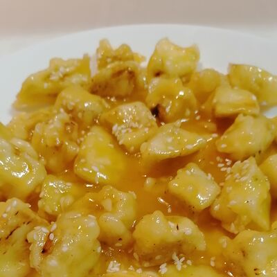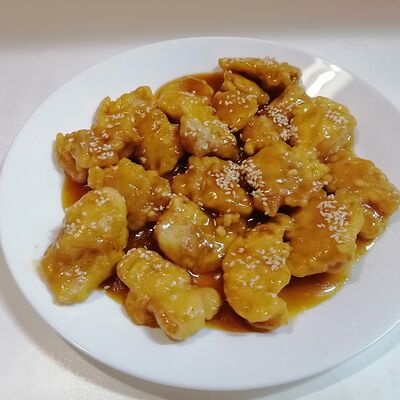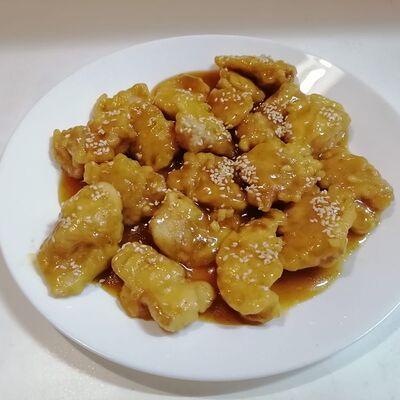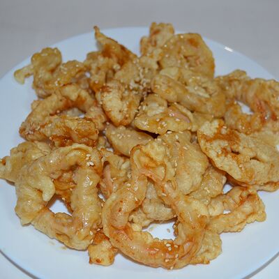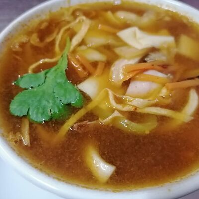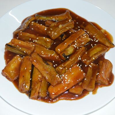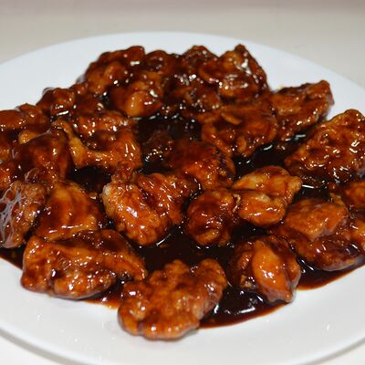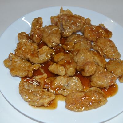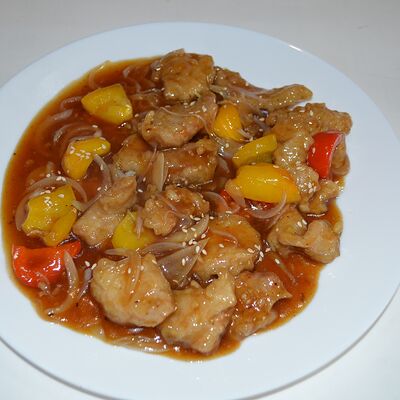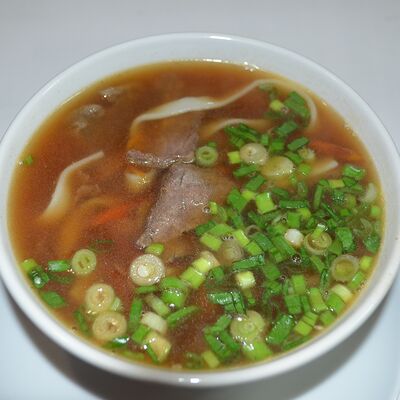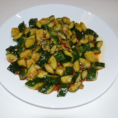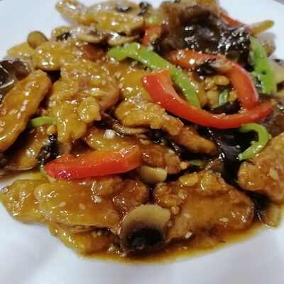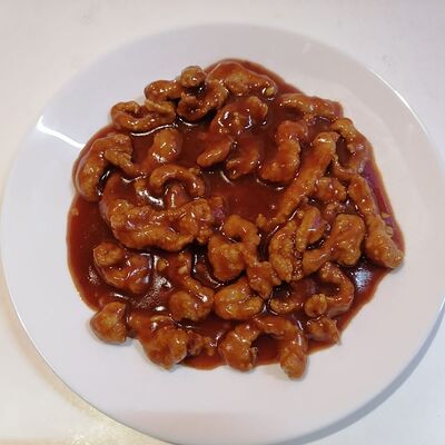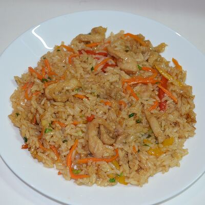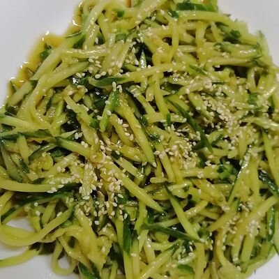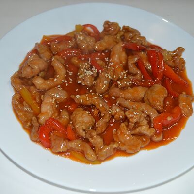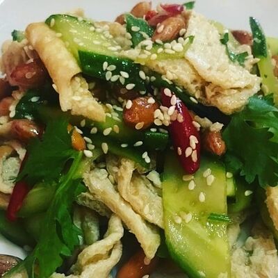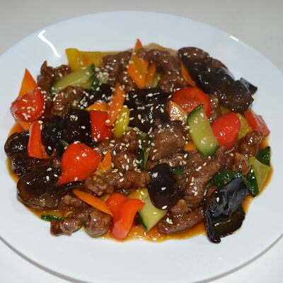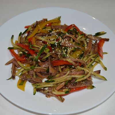 Фунчоза, морковь по-корейски, болгарский перец, огурец, обжаренная говядина, кунжут, устричный соус (средней остроты)