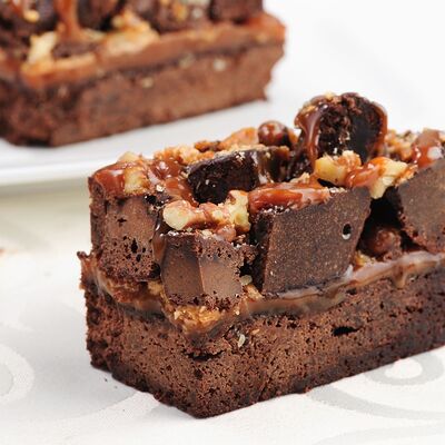 Два слоя сочного шоколадного брауни, пропитанные густой карамелью, сверху украшены засахаренными кусочками брауни и орехами пекан