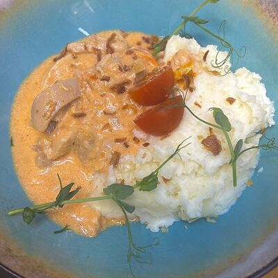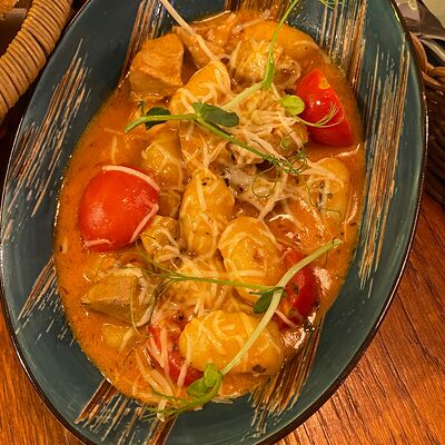 Форель, картофель, лук репчатый, морковь, помидор, специи, сливки, зелень