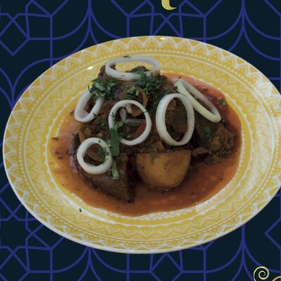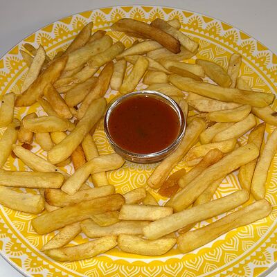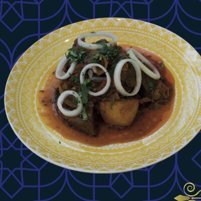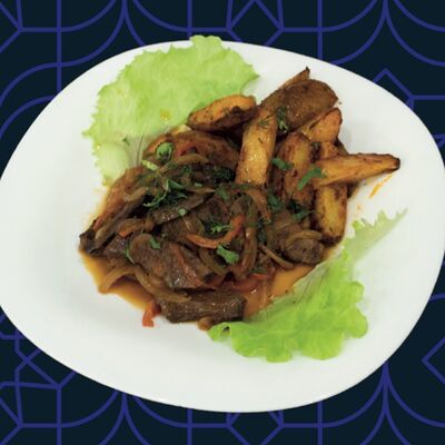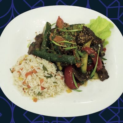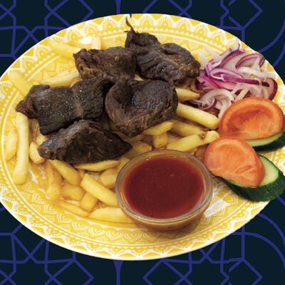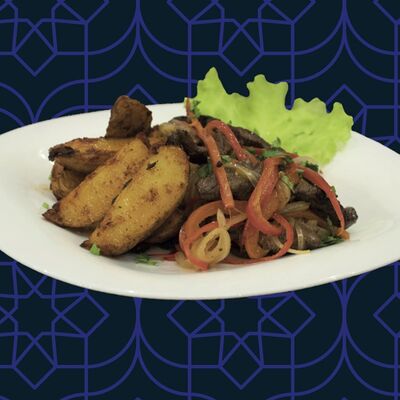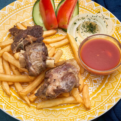 Баранина, картофель фри, овощи, лук