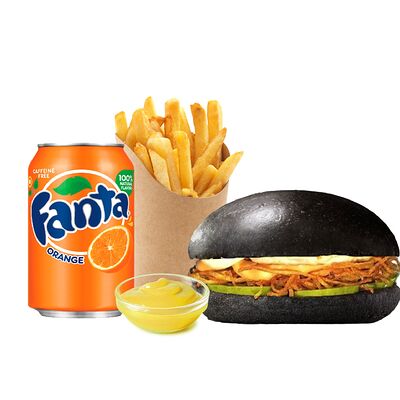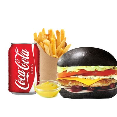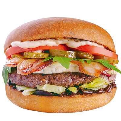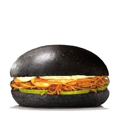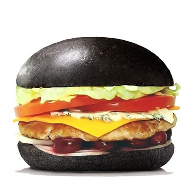 Черная булочка бриошь, котлета из говядины (охлажденная), сыр блю чиз, сыр чеддер, помидор, лук репчатый, салат, соус вишневый, соус фирменный