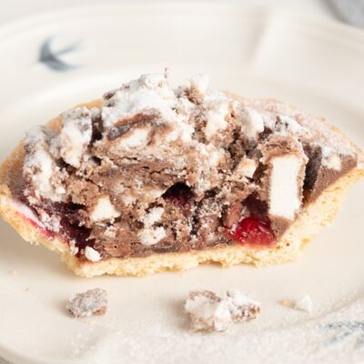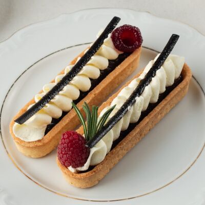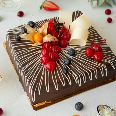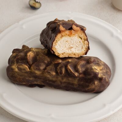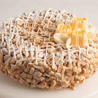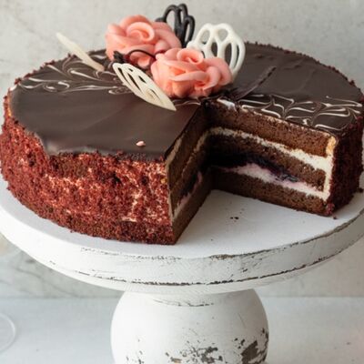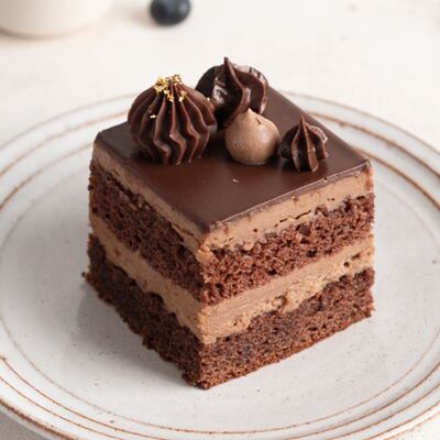 Бисквит пропитан сиропом с добавлением коньяка. Пирожное прослоено сливочным шоколадным кремом, меренгами и шоколадом