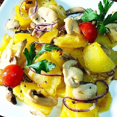 Картофель с жареными грибами (шампиньонами), красным луком и зеленью