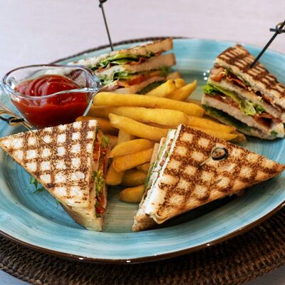 Хлеб пшеничный, салат фриллис, помидоры, огурец свежий, сыр российский, ветчина индейки, соус сэндвич с ветчиной (сметана, майонез, кетчуп, укроп, петрушка, чеснок)