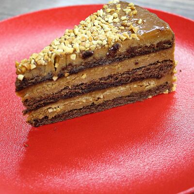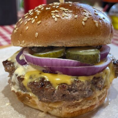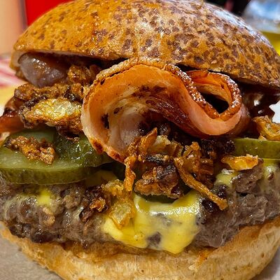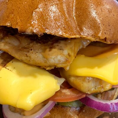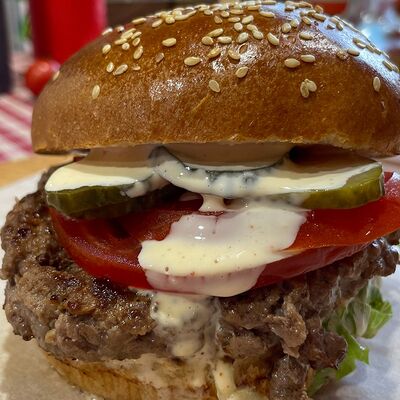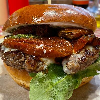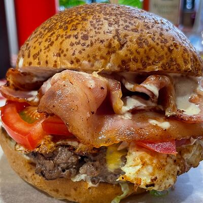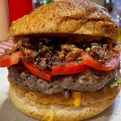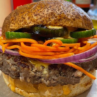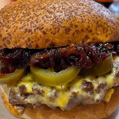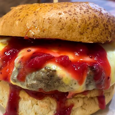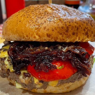 Булочка бриошь, котлета из мраморной говядины Xl, сыр чеддер, соус Кола-барбекю, соус Шрирача, свежие томаты, луковый мармелад, перец халапеньо
