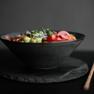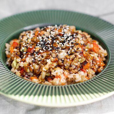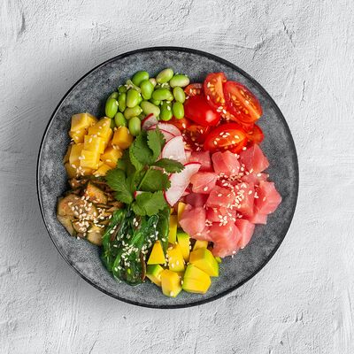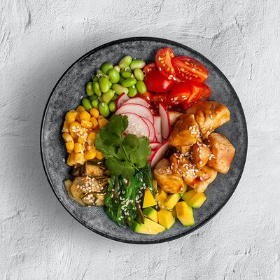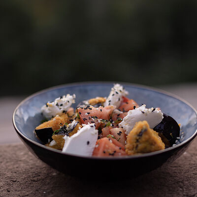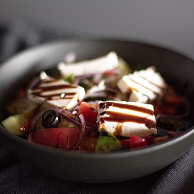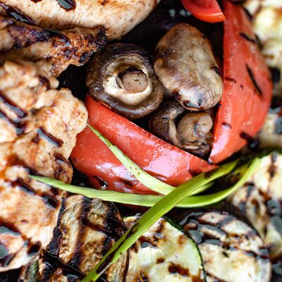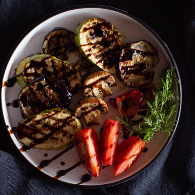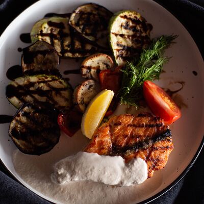 Филе форели, баклажан, кабачок, перец болгарский, шампиньон, черри, зелень, бальзамический крем, соус сливочный
