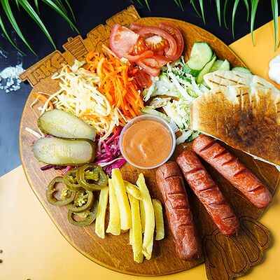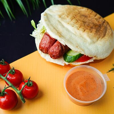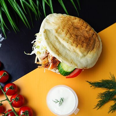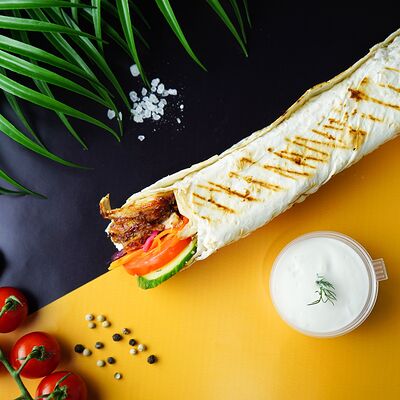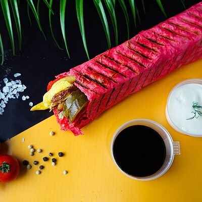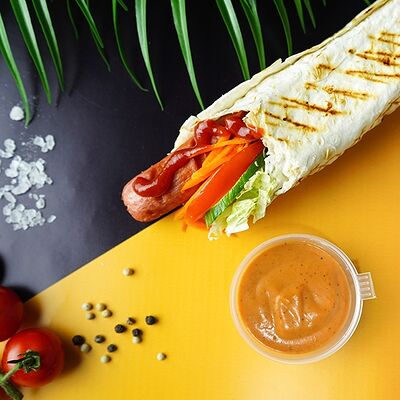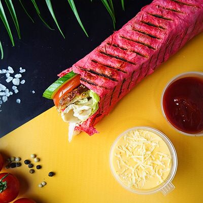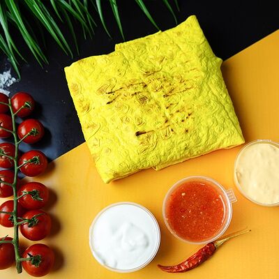 Сырный лаваш, куриное мясо, свежие овощи, халапеньо, сырный, соус чесночный, аджика