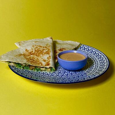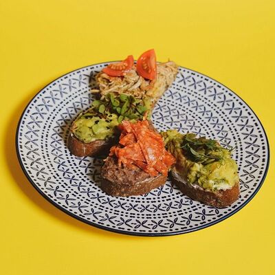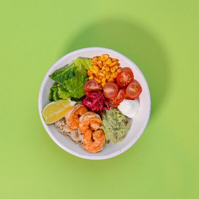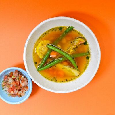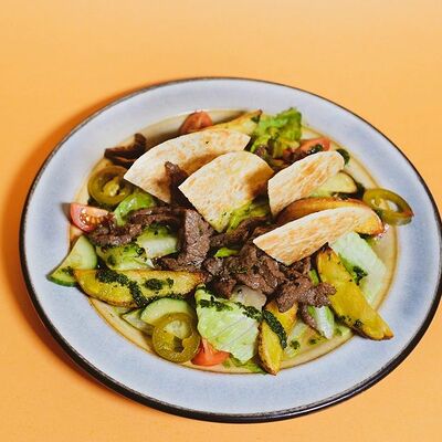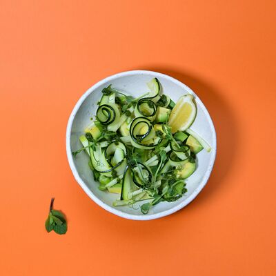 Салат из 9 зеленых ингредиентов: яблоко зеленое, сельдерей, авокадо, цукини, микс-салат, проростки гороха, огурец, лайм, соус чимичурри