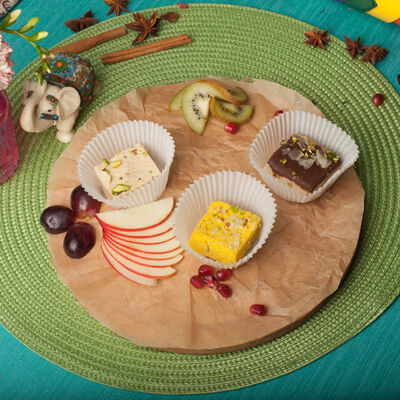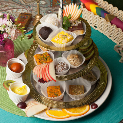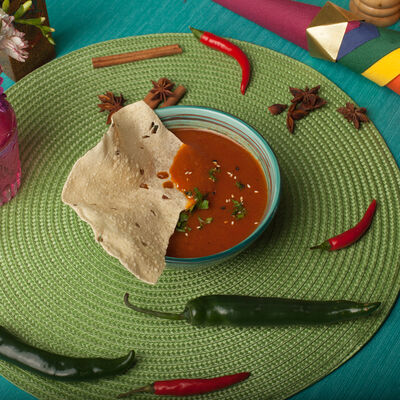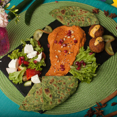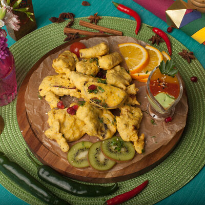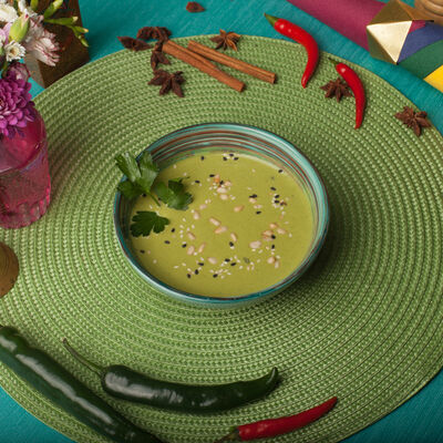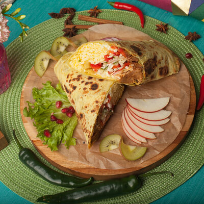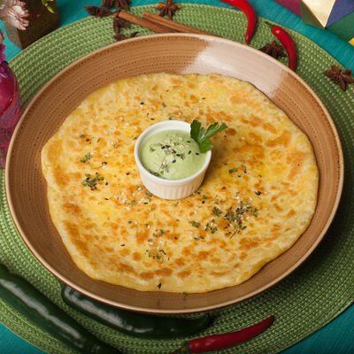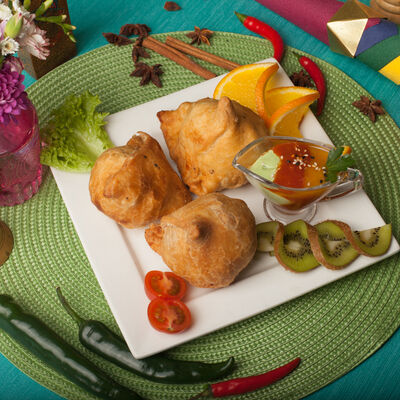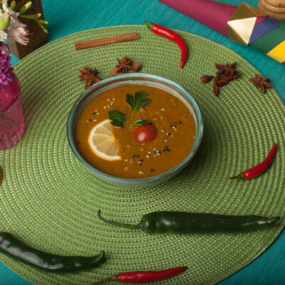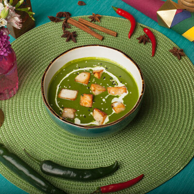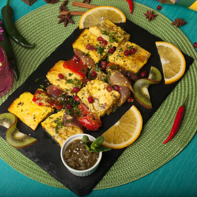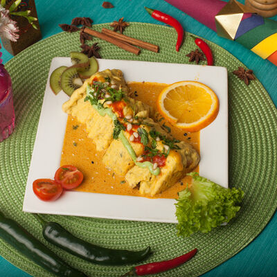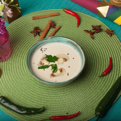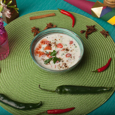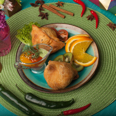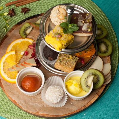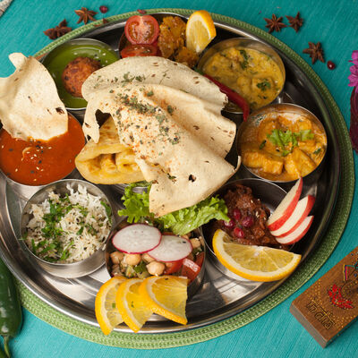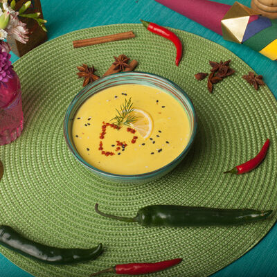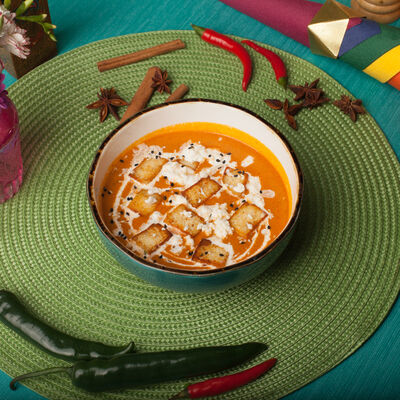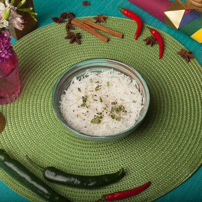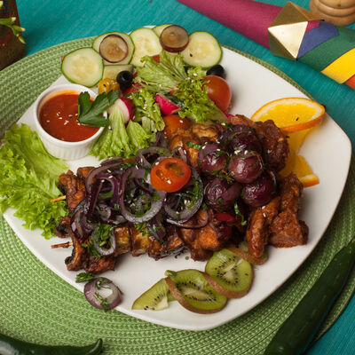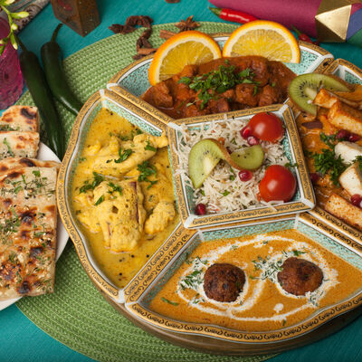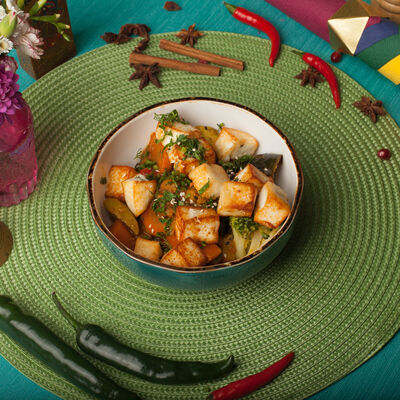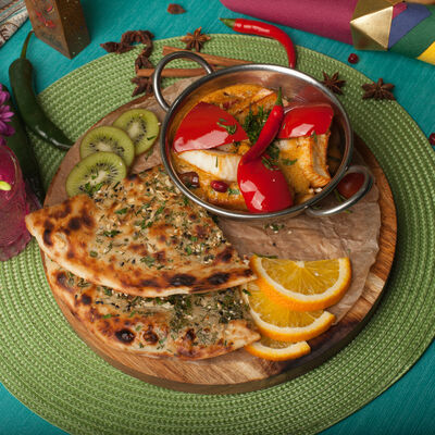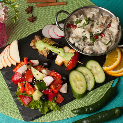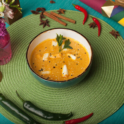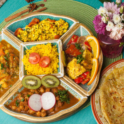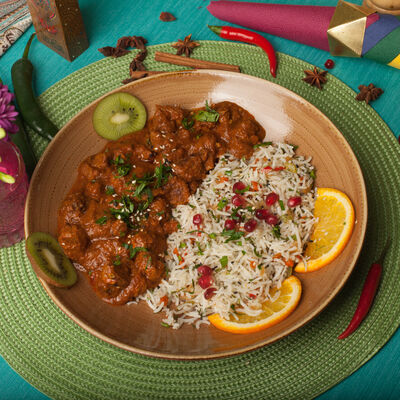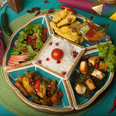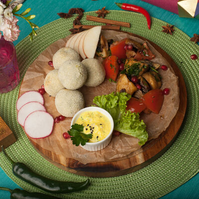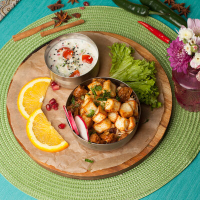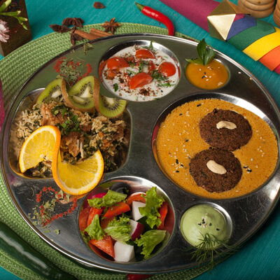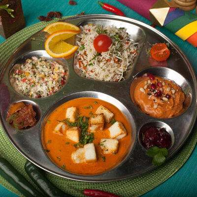 Плов из риса басмати с паниром, соевым мясом и овощами: болгарским перцем, кабачком, морковью, горошком, а также с изюмом и кешью. Подается с супом Раита