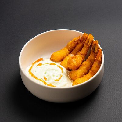 Креветки в панировке, мука, яйцо, молоко, бульон хондаши, сухари панко, соль, соус тайский чили, томаты, кунжут, кокосовое молоко, сливочный сыр, васаби, сок лимона