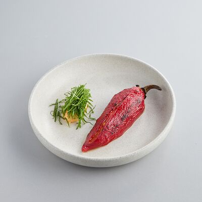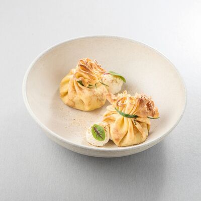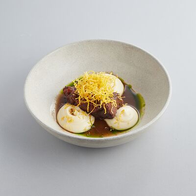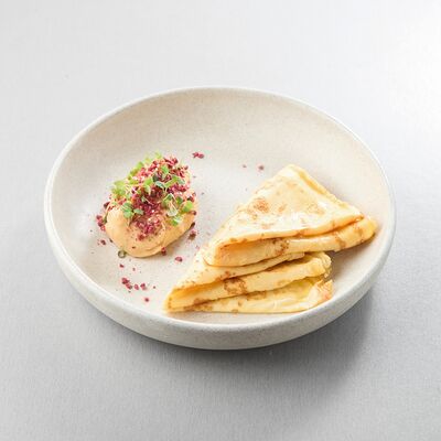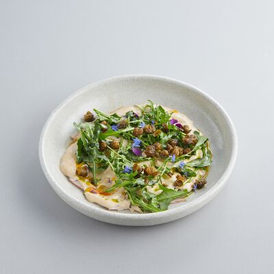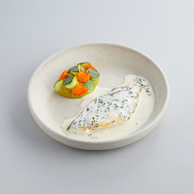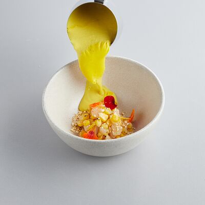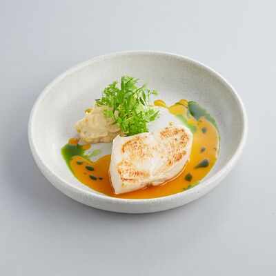 Индейка варится в су-виде с добавлением масла нуазет и трюфельного масла, перед подачей обжаривается на растительном масле. Пюре из корня сельдерея (обжаренный корень сельдерея, затем сваренный в сливках и перебитый в блендере), также добавляется корень и стебель сельдерея, варенье из лука-шалот (винный уксус, соль, сахар, шалот), морковный соус (соус из ферментированной моркови с добавлением масла нуазет, сахара и глюкозы). Украшается кервелем и зеленым маслом