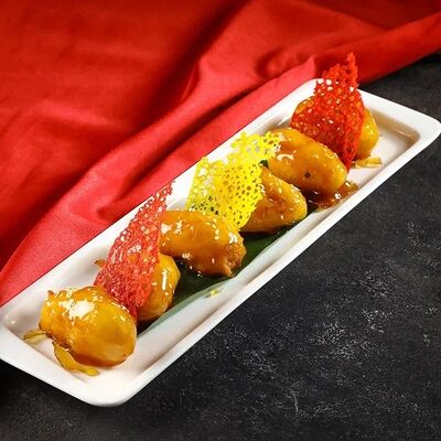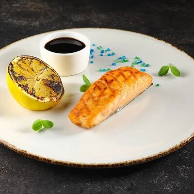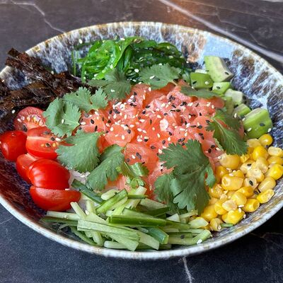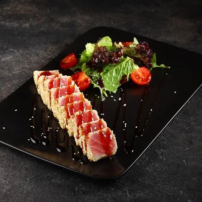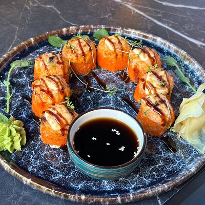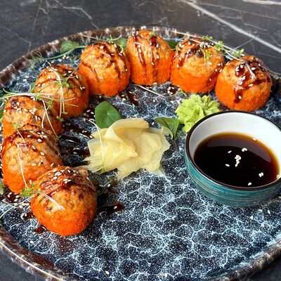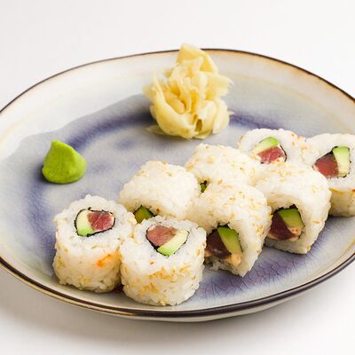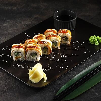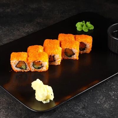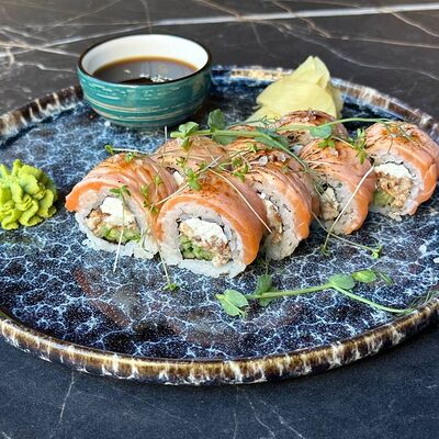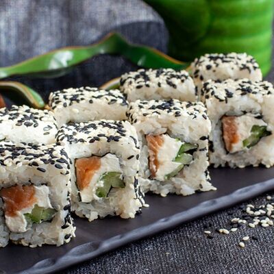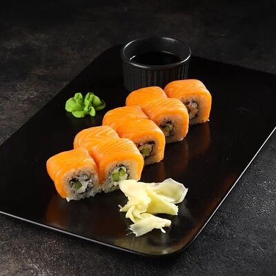 Рис, нори, сливочный сыр, огурец, лосось (внутри), кунжут. Подается с васаби, имбирем и соевым соусом