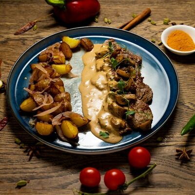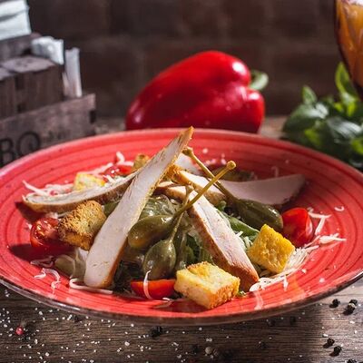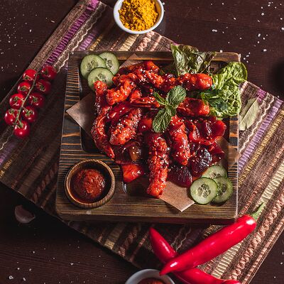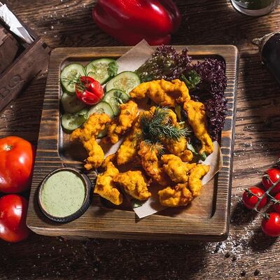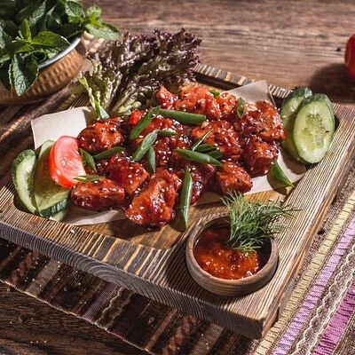 Сочное филе курицы, лук, болгарский перец, пикантный соус, кляр из кукурузной муки и яйца
