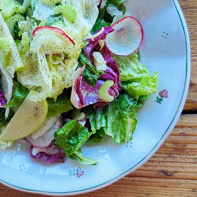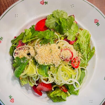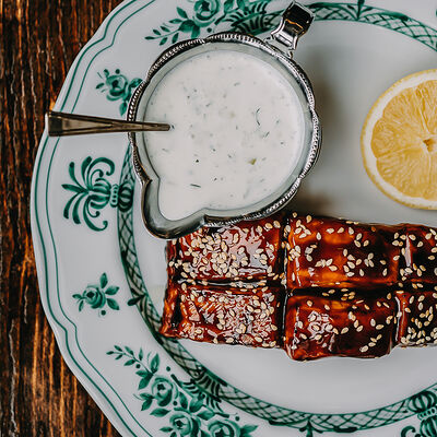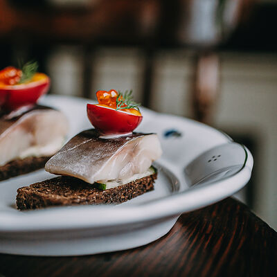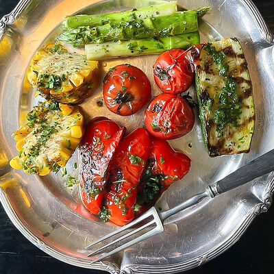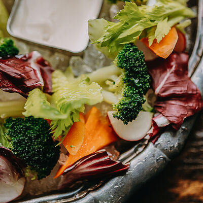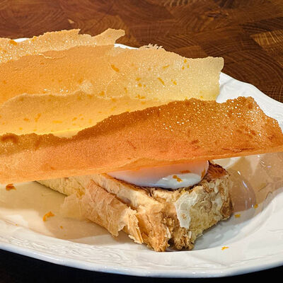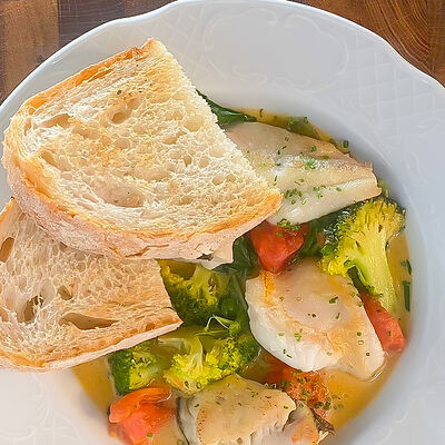 Камбала обжаривается с брокколи, чесноком, базиликом, тимьяном, дальше добавляются бланшированные каперсы, оливки и томаты, и заливается соусом бермонте, в конце добавляем мини-шпинат. Сервируется с обжаренным тартином