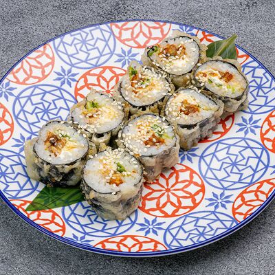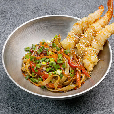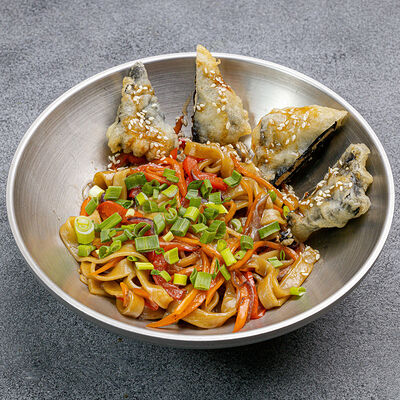 Домашняя лапша удон, тофу, нори, темпура, сладкий перец, морковь, красный лук, зеленый лук, унаги соус, кунжут