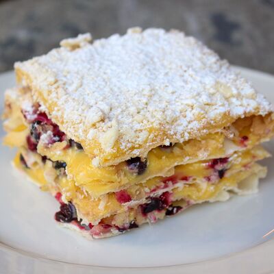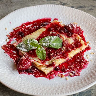 Тесто: мука, яйцо, сливочное масло, ванильный сахар, молоко Ягодное варенье, мята