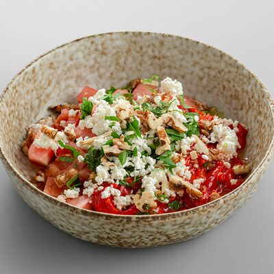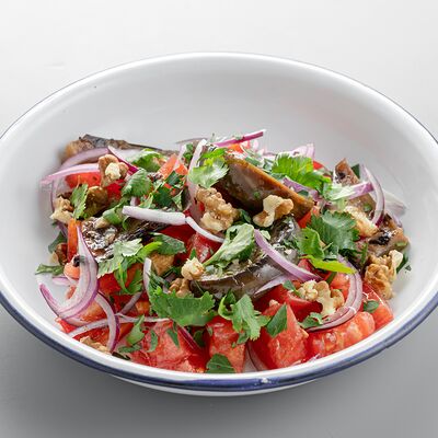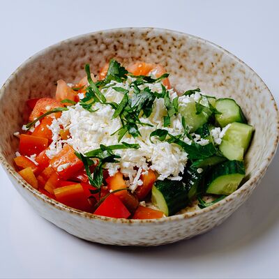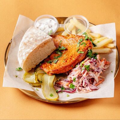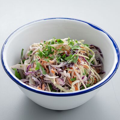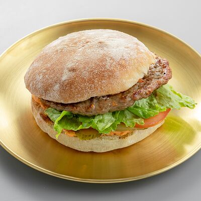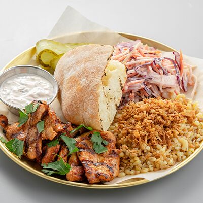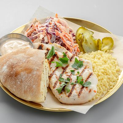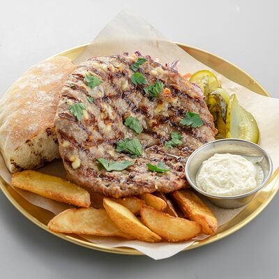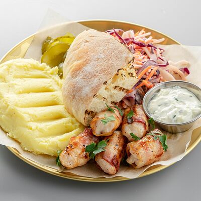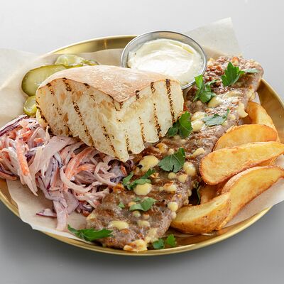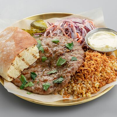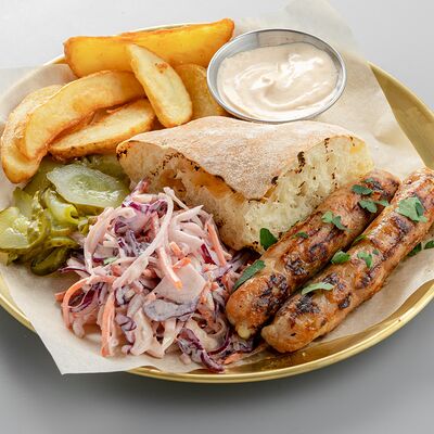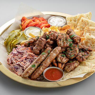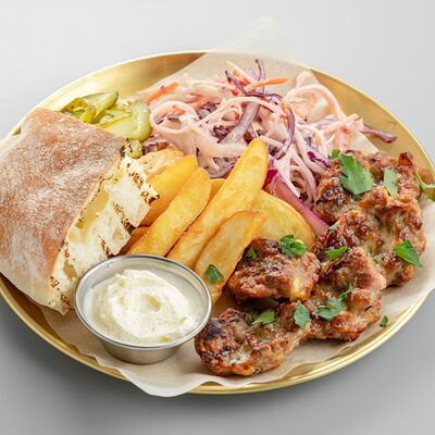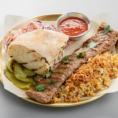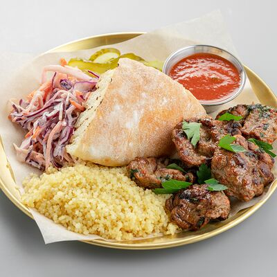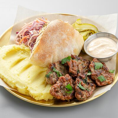 Шиш-чевап из фермерской говядины и свинины, соус и гарнир на выбор, маринованный огурец, хлеб сомун, салат коул слоу ( из двух видов капуст, морковь, салатной заправки из уксуса, соли, черного перца и майонеза)