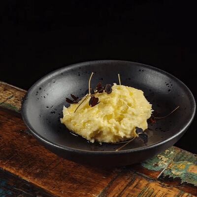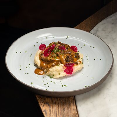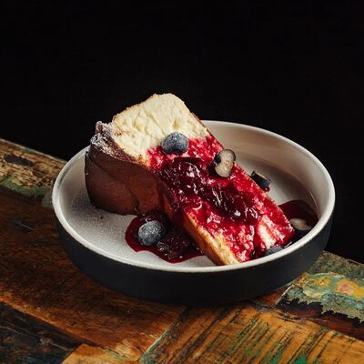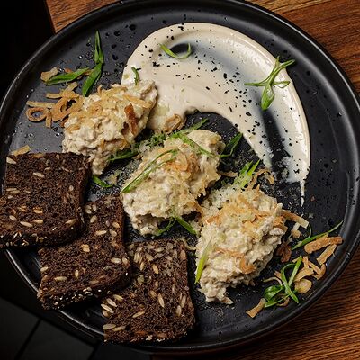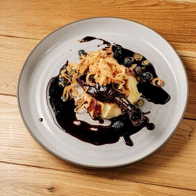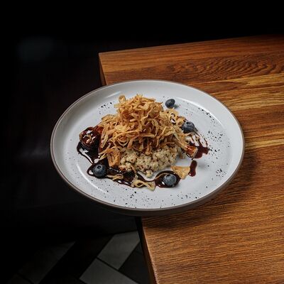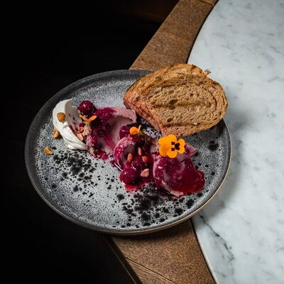 Подаём со сливочным сыром, карамелизированным фундуком, компоте из вишни и тостами из черного хлеба