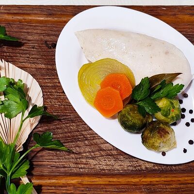 Пекинская капуста, грудка куриная отварная, сыр пармезан, помидоры, соус Цезарь, сухарики