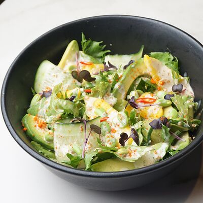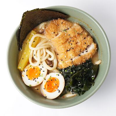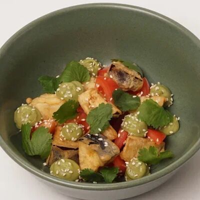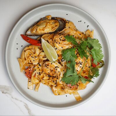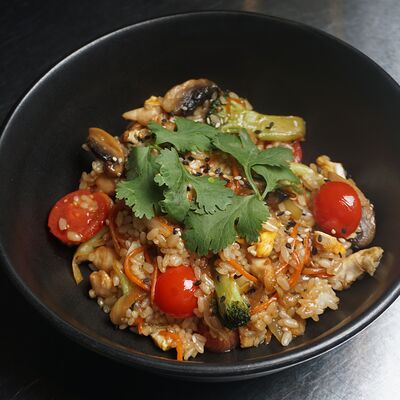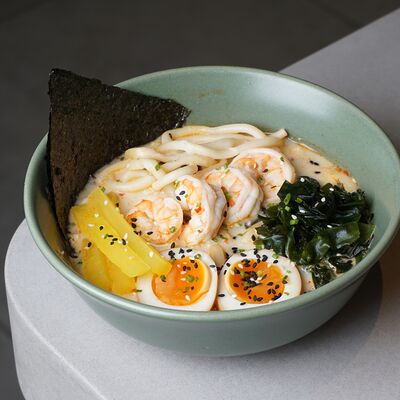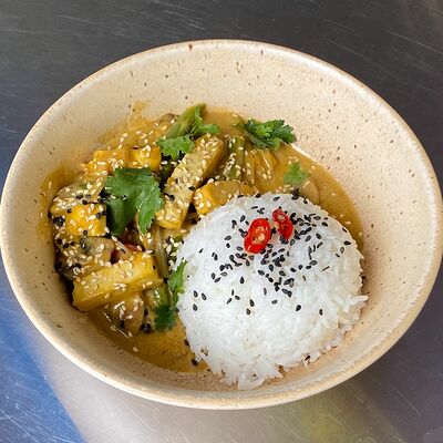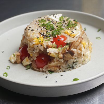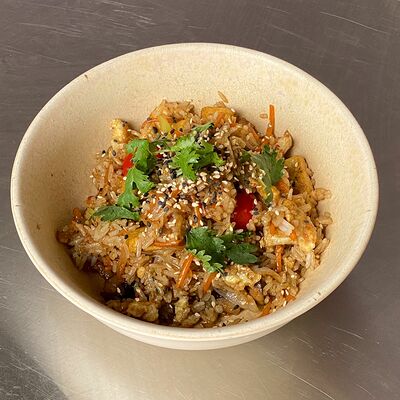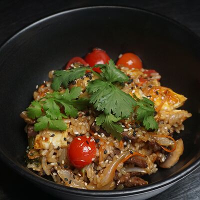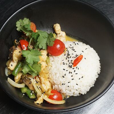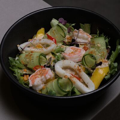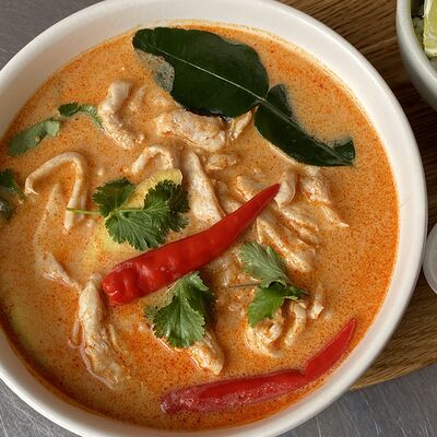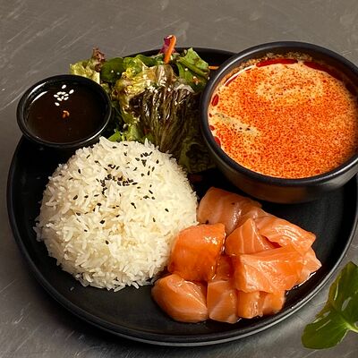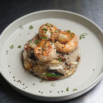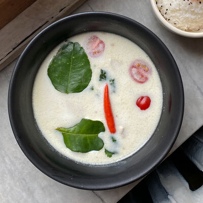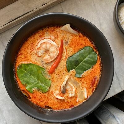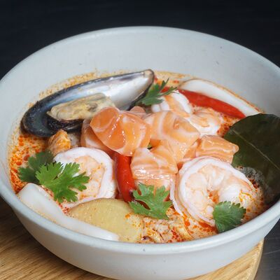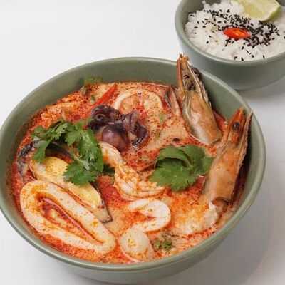 Кисло-острый суп с морепродуктами (креветки, кальмары, мидия) и грибами, подаётся с рисом