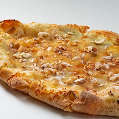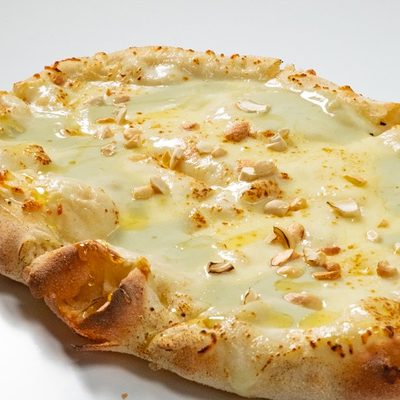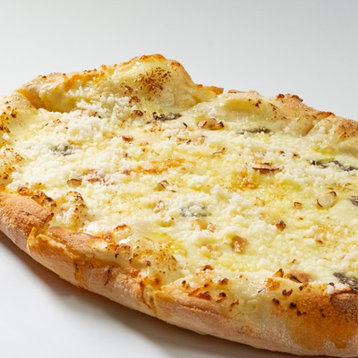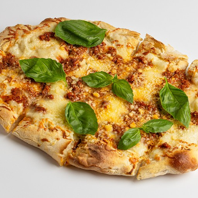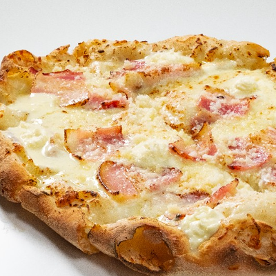 Фирменное хрустящее тесто в соусе карбонара с кусочками бекона и итальянской пармы под сыром моцарелла и чесночным маслом (основа для пиццы 15x20 см)