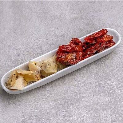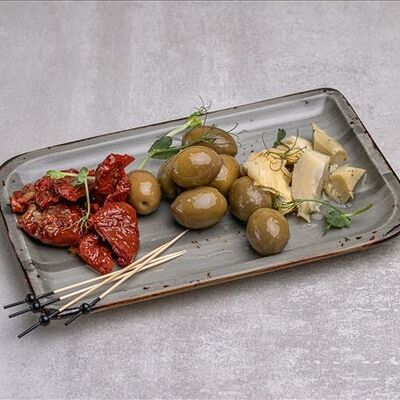 Антипасти - это изысканное итальянское блюдо, представляющее собой ассорти различных закусок. В нашем варианте это артишоки, вяленые томаты, оливки гиганти и маслины гиганти, которые вместе создают идеальное сочетание вкусов и текстур